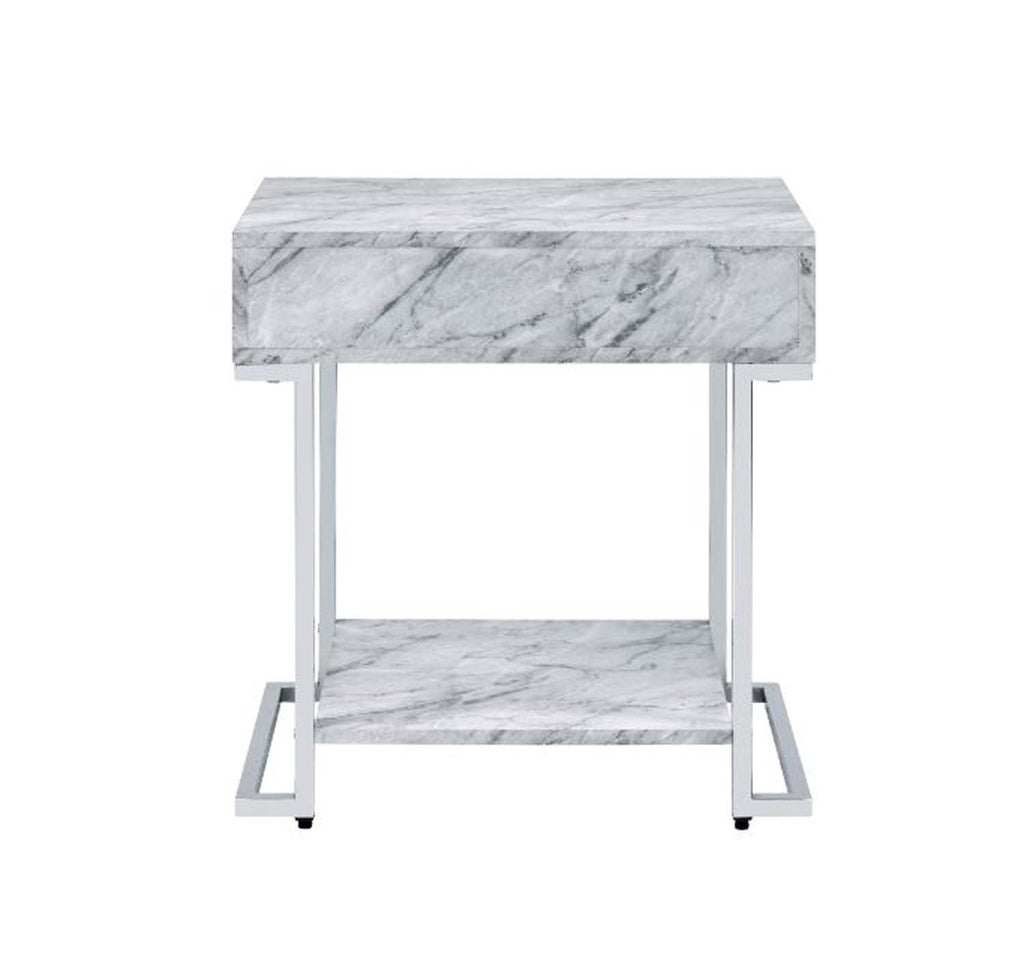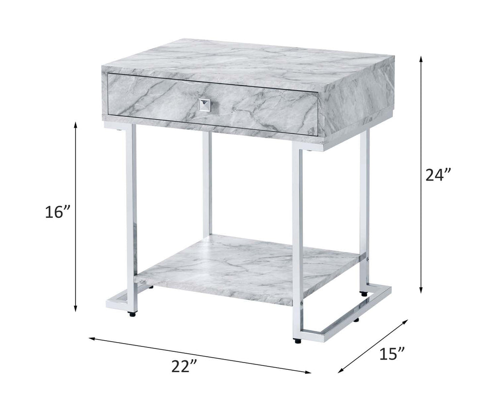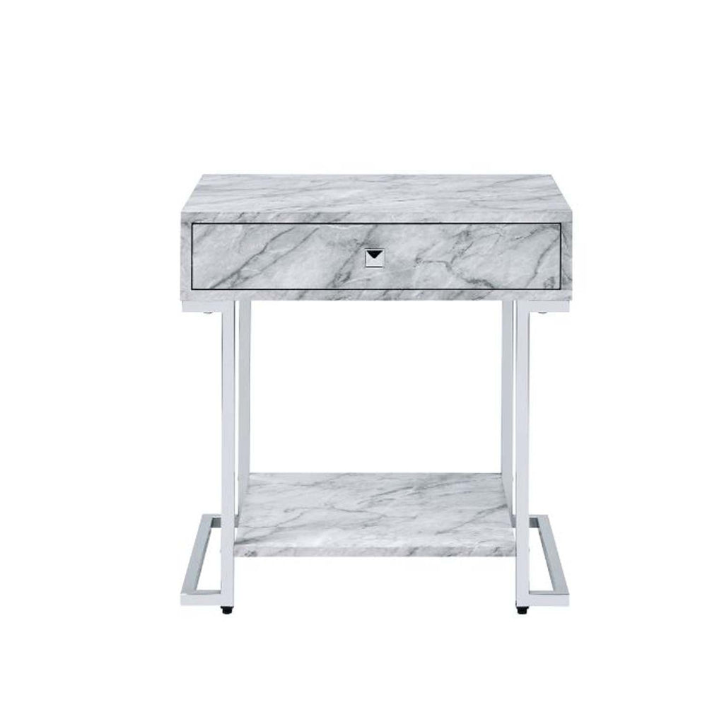 Use this brilliant work to add extra storage spaces while enhance your room decor. Metal sled base creates a modern silhouette of sleek, straight lines, with chrome finish for added subtle sheen. White faux marble table top and bottom shelf feature beautiful textures, providing a perfect place to display your personal style. There is also a storage drawer that hold odds and ends for keeping table top clean and tidy.