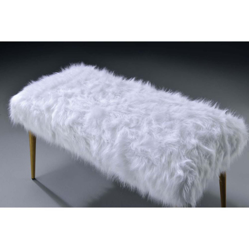 Exude an air of sophistication and comfort with this Bagley II bench. Featuring White faux fur seat cushion and Gold metal base, this armless lounge bench is destined to be your favorite piece. Regardless where you placed it, it will always be the attention-getter.