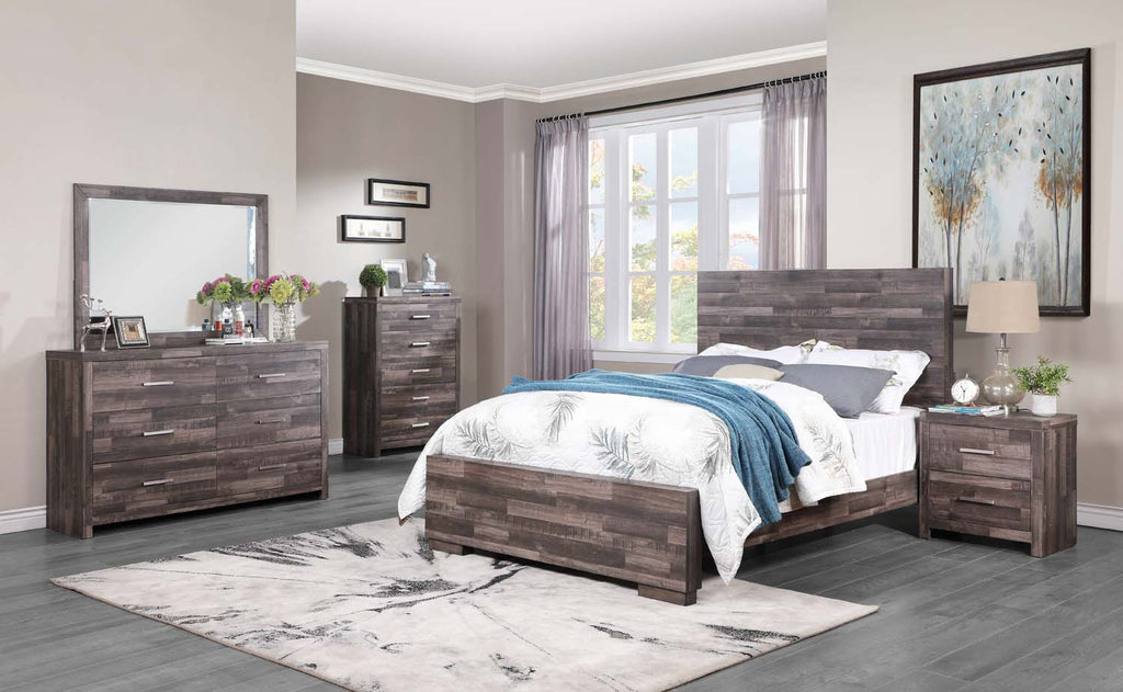 With the pronounced look of butcher block in dark oak finish, the Juniper bed brings a modern yet robust atmosphere. The matching case goods come with center under-mount metal glides, veneer lined drawers, and single metal pull handles. A serious statement of sustainable living its achieved within this collection.