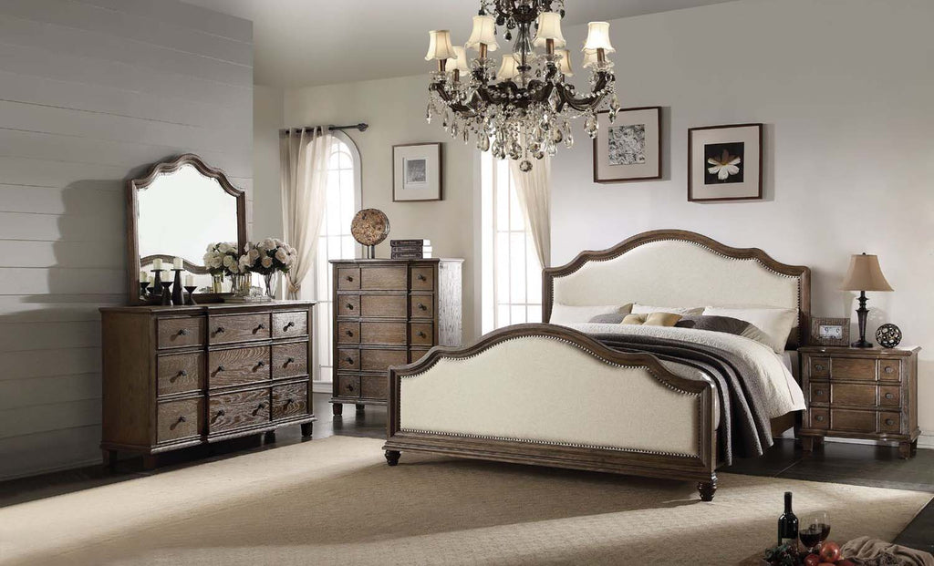 The Baudouin collection is the embodiment of hominess and comfort. Crafted with simple shape headboard and footboard and beige linen padded, matching case goods in distress gray finish, this
