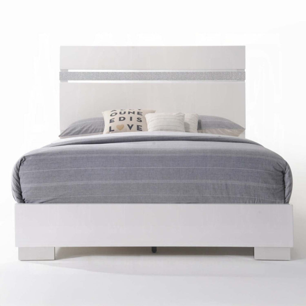 The Naima bedroom collection offers sophisticated look, clean lines and contemporary style. Features panel headboard, and low profile footboard in bright white finish with contrasting light gray trim panel, which provides elegant style that will bring you a perfect sleek design for your home.
