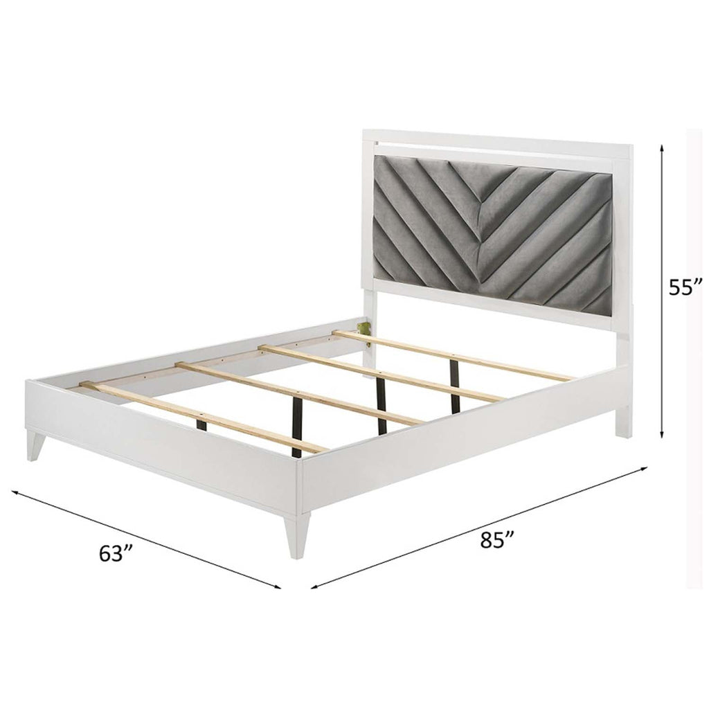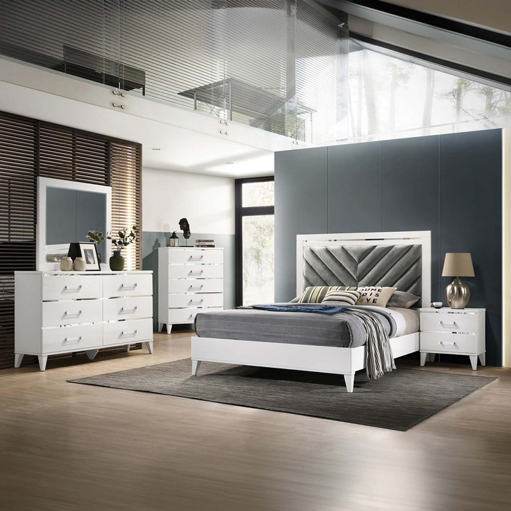 Sleep in style with this modern Chelsie bedroom collection. The sturdy bed is a focal point on its own with its gray channel-tufted headboard and tapered legs. Add depth and reflect light with its silver trim that is featured throughout the bed and case goods. All case goods offer plenty of storage options that are perfect to suit your needs. The white finish is excellent for adding a splash of color throughout your space without it clashing.