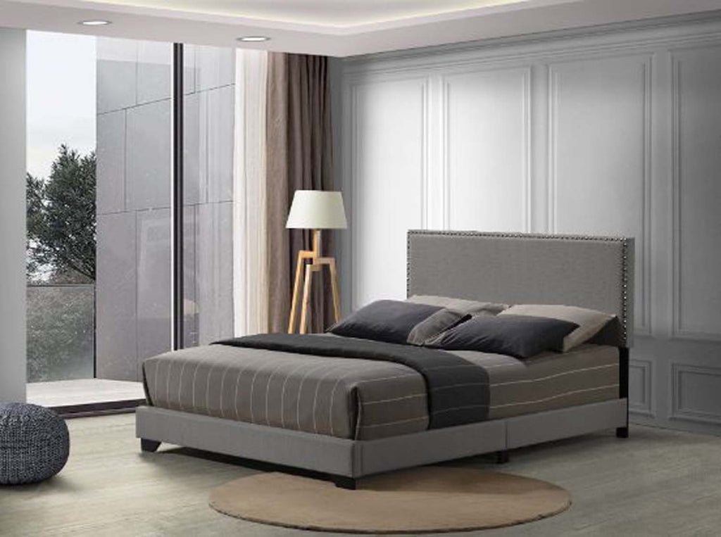 Solid color accent and ultra-sleek minimalist associate your bedroom with a modern aesthetic.  Warm and soft fabric fully covers the bed from headboard to side rails to complete a comfy casual look.  Nailhead trim adds a decorative border to the headboard, accentuating its crisp clean lines.  Sturdy slat system is added to the bed frame for supporting your bedding and box spring.