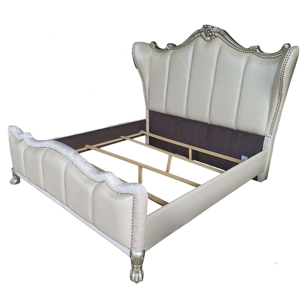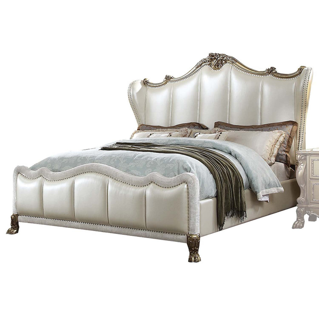 The Dresden II bedroom collection is exclusively designed and filled with romantic spirit. A piece crafted and inspired by the luxurious designs of the past, this gorgeous bed features a stunning champagne PU headboard and footboard with nail head trim and an elegant gold patina accent finish. Expertly detailed, this gorgeous bed features a tufted headboard with elaborate carvings on its wood frame.