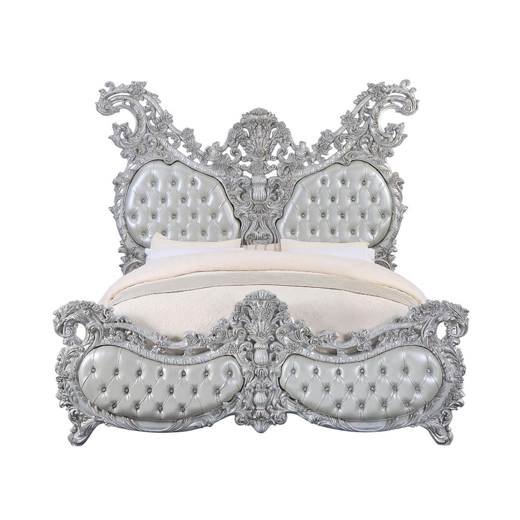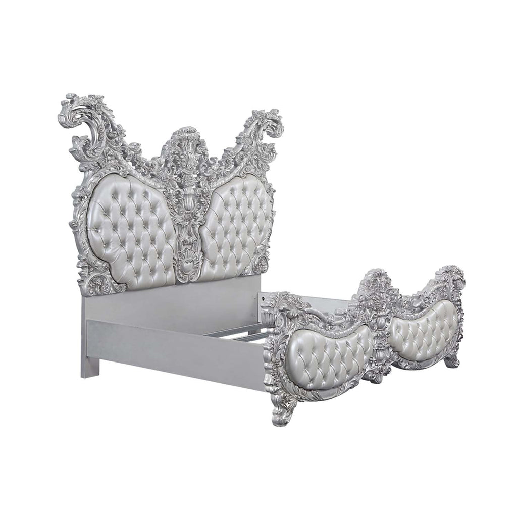 Characterized with button-tufted upholstery, intricate scrollwork, and lustrous finish, the Valkyrie Bedroom Collection provides the feeling of luxury and sophistication. Ornate carvings with floral scroll design on each piece boast extravagant silhouettes and dramatic style. Antique platinum finish paired with muted gray tone fills the collection with a noble and elegant flair. Give your interior a royal touch and classic look with the Valkyrie Bedroom Collection.