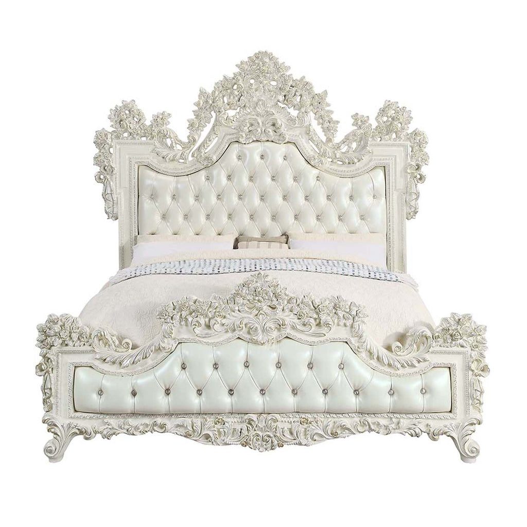 Bringing a modern approach to the classic ornate Rococo style, the Adara bed blends in contemporary touches with traditional design details. The PU adds a fresh approach to the intricately embellished bed. The antique white is embellished with light gold hand brushed details to make the floral motifs pop. This is one statement piece that will impress everyone.