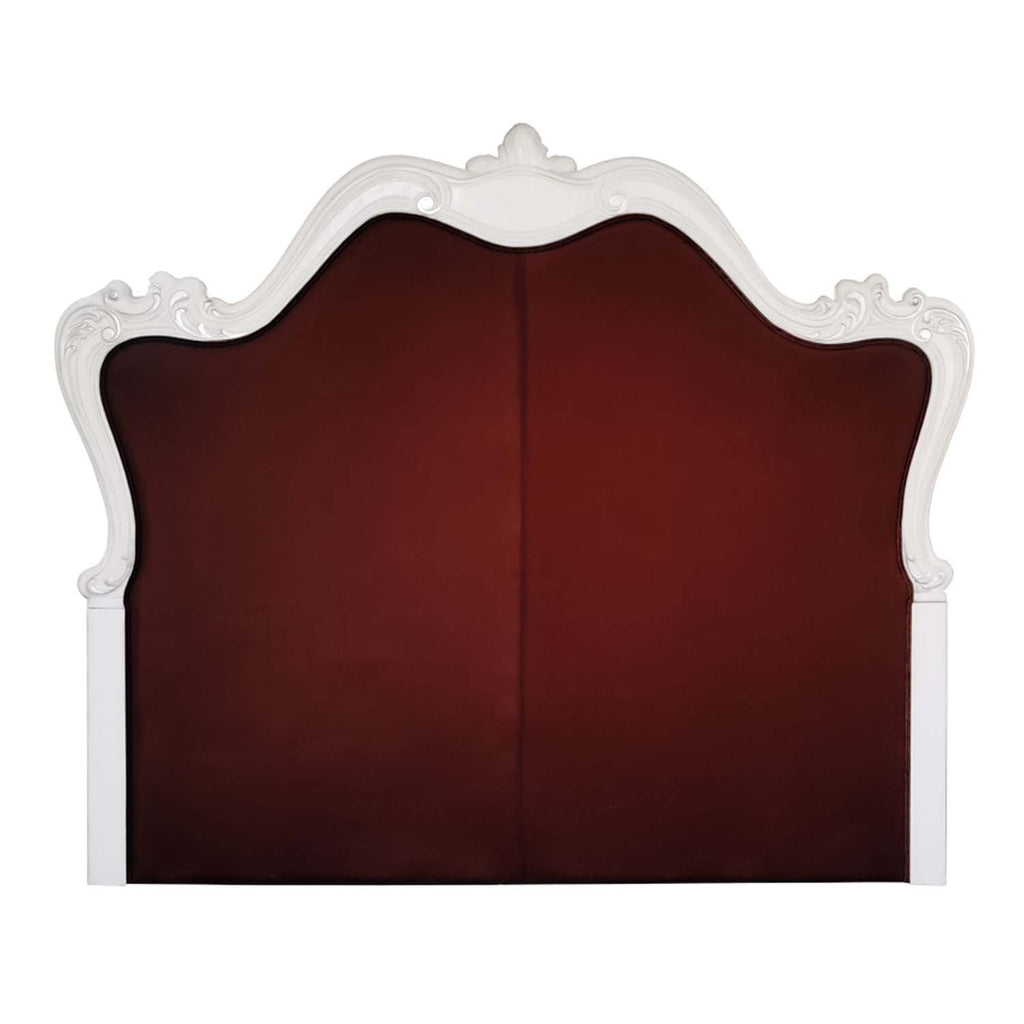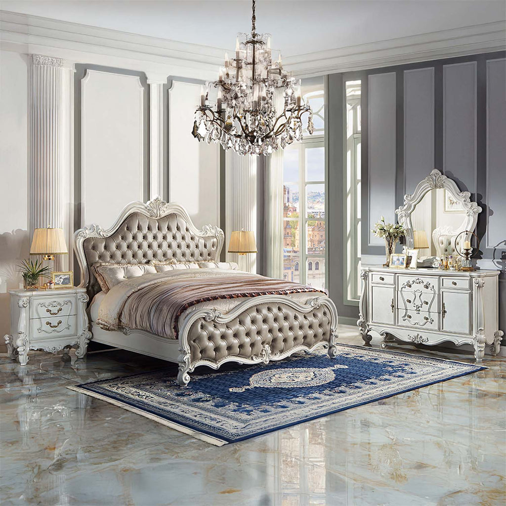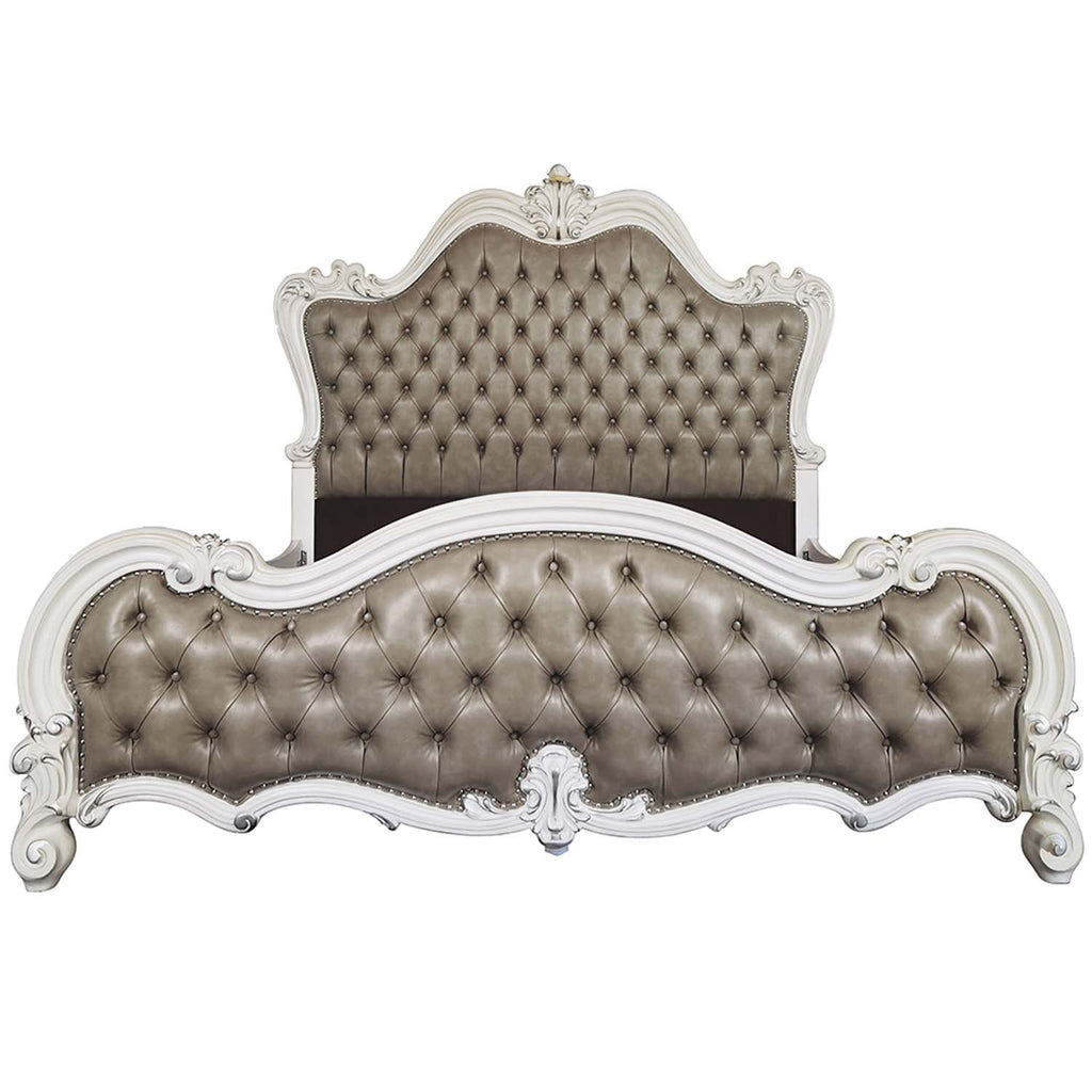 Turn your bedroom into a classy abode with this sophisticated Versailles II bed in a vintage gray PU and bone white finish. The curved wood trim on the headboard and footboard is accentuated with a fluted seashell motif crown. The deep button tufting adds decadent comfort elevates the extravagance of any bedroom.