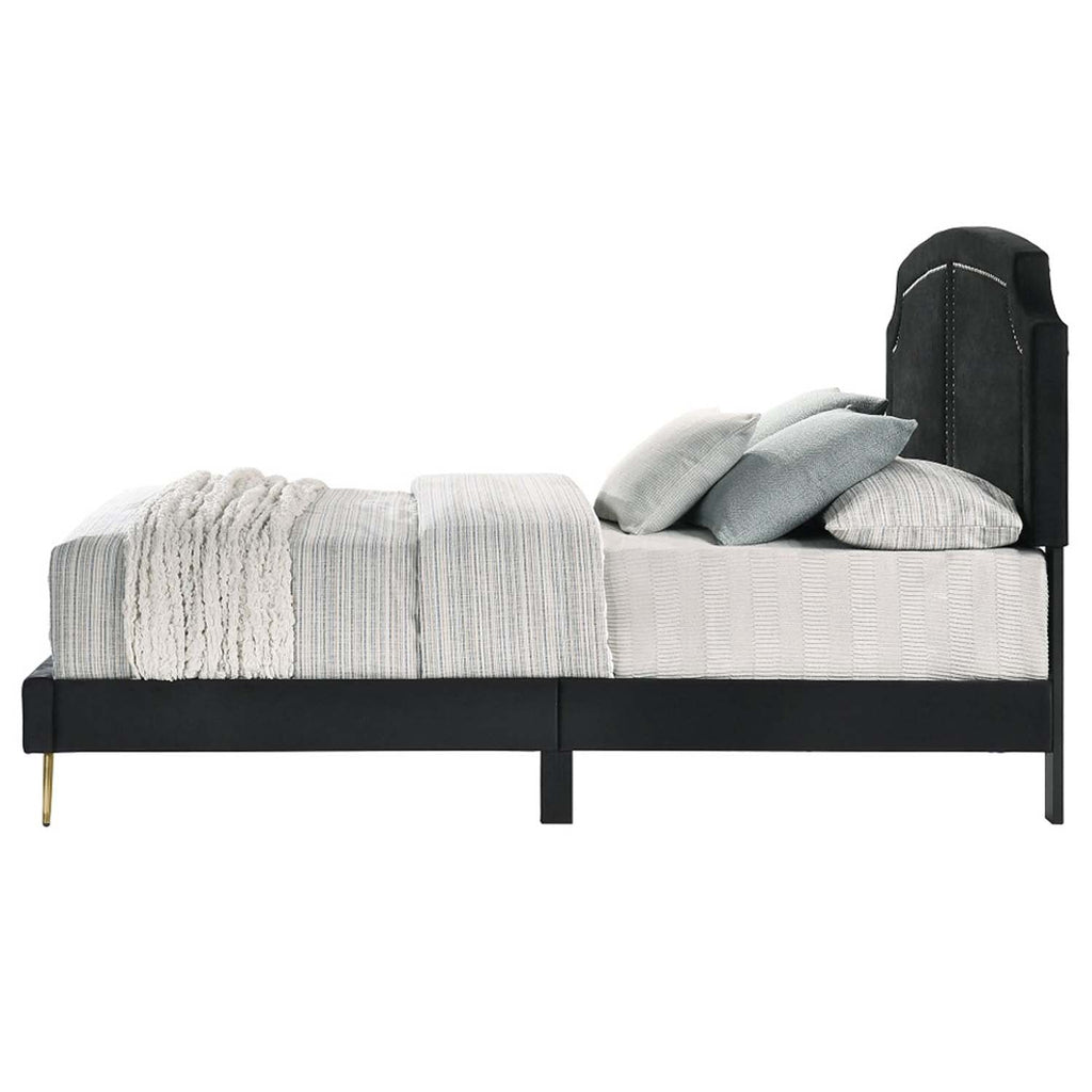 This Zeena bed anchors your bedroom in elegant French country style. The black velvet upholstered headboard strikes a cavendish silhouette with nailhead trim along the edges and center for a hint of glam. This bed includes four slats and four center support legs. The use of a box spring is required along with your mattress of choice. The gold metal footboard legs finish off the bed.