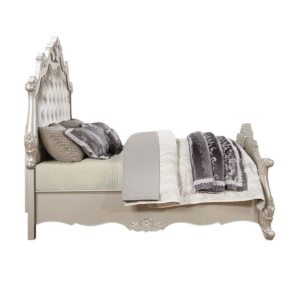 Create the bedroom of your dreams with our bed, which includes a magnificent bedframe with a headboard adorned with stunning floral and scroll details. This Bently bed features a button-tufted headboard and footboard that is upholstered in lush fabric. The beautiful, scalloped edges add refinement and visual interest. The champagne finish is rich and sophisticated.