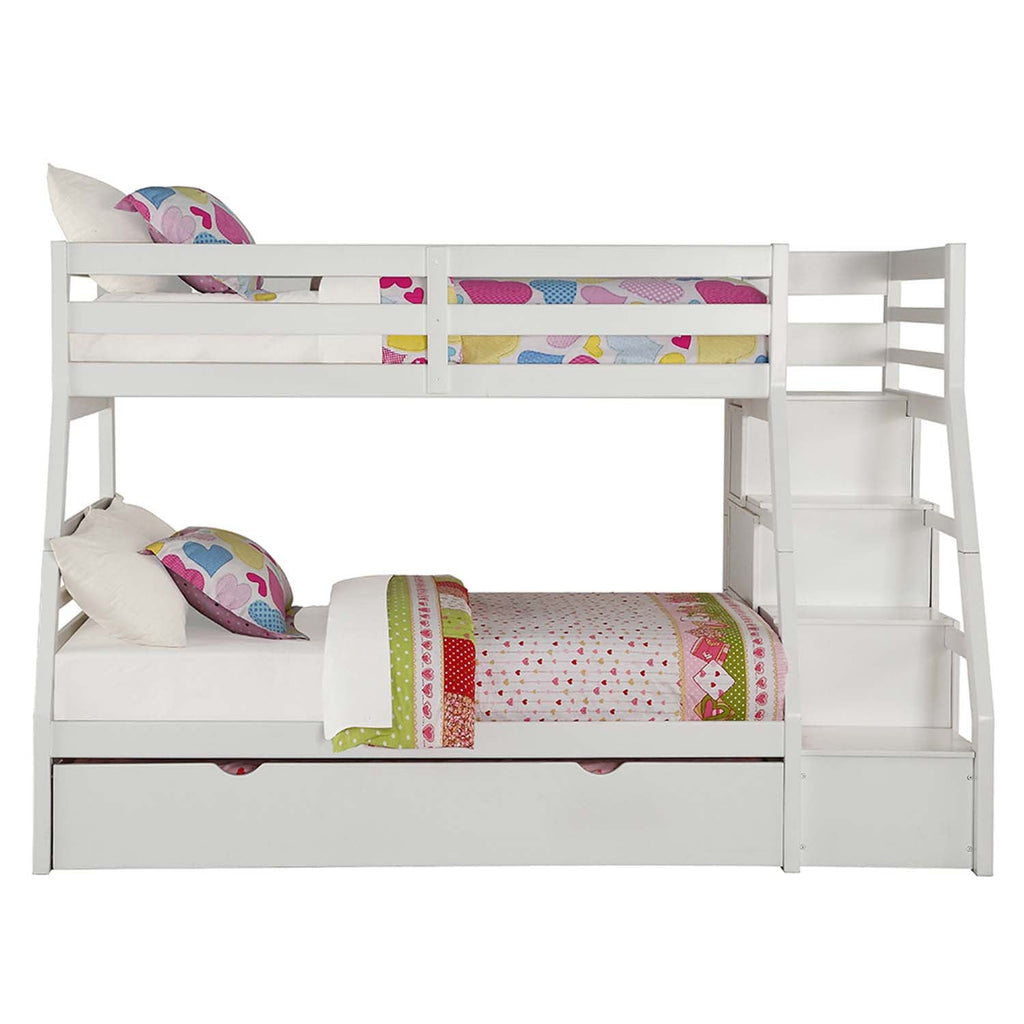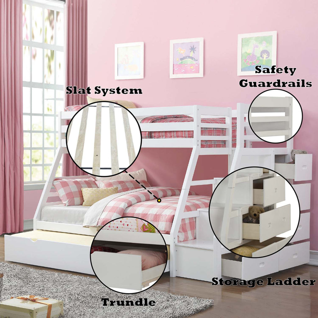 This Jason bunk bed is a twin over full bunk bed with plenty of built in storage with drawers incorporated into the stairs to upper twin bed. An additional trundle pull out bed under the lower full bed creates more space for extra use. A full guard rail will always keep your lovely kids safe.