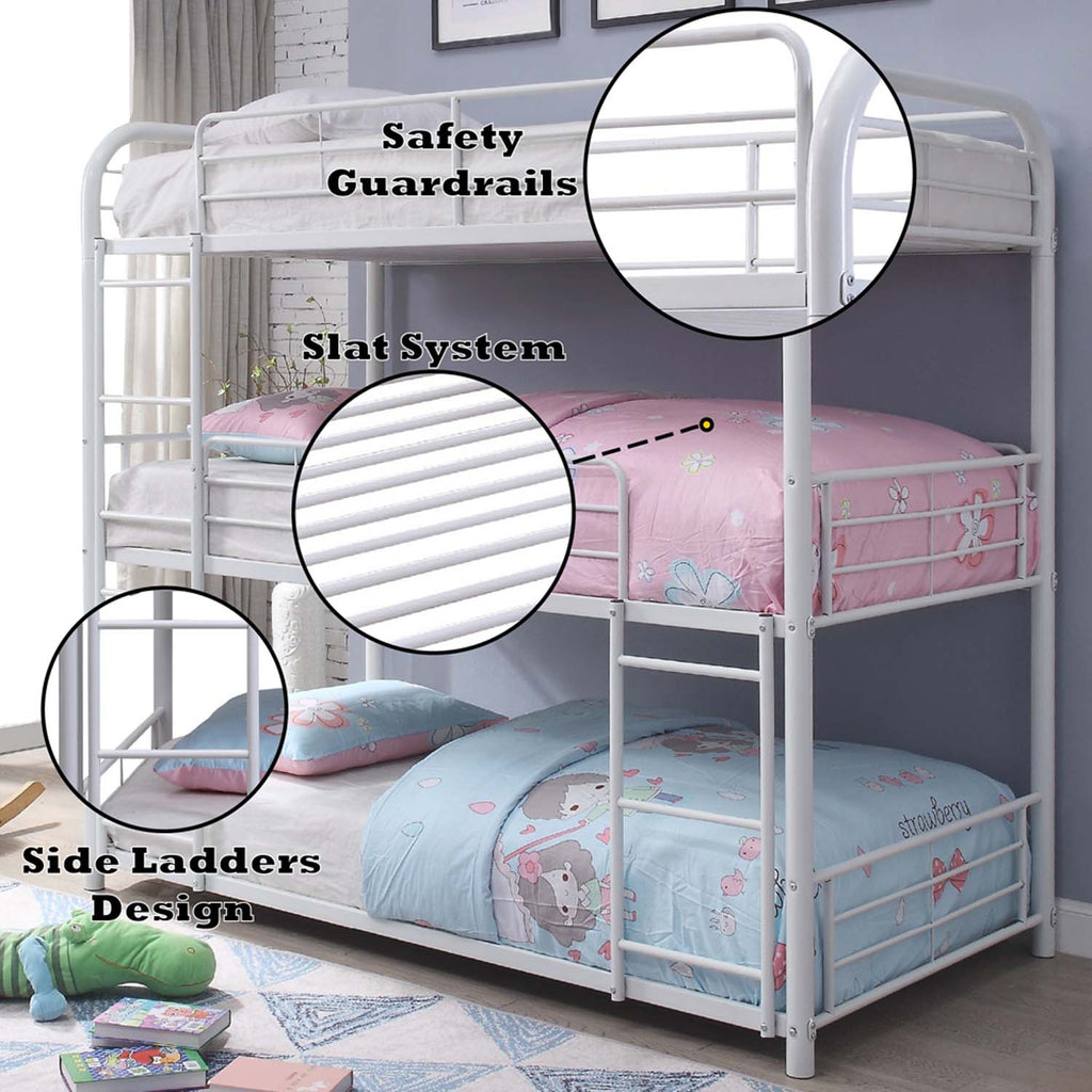 The ultimate space saver for small rooms, the Cairo triple metal bunk bed will be the best addition for your sweet home. Stacking three beds securely, the easy access guardrails keep your kids snug and secure, while the two built-in ladders offer easy access. This bunk bed is available in both twin and full size in smooth sandy black, white, gunmetal, and silver finishes.