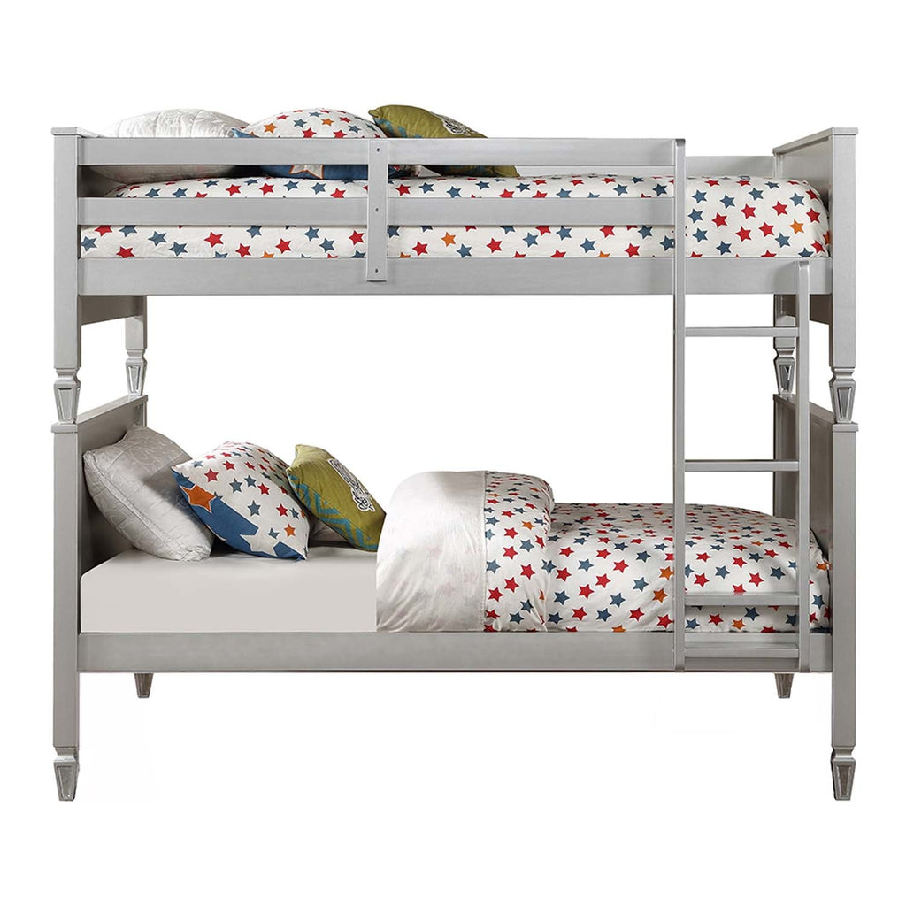 Fulfill your children's dreams of being royalty with this Varian twin over twin bunk bed and trundle. With elegant details such as a silver finish, button-tufted velvet upholstered headboard and footboard panels, and beautifully tapered legs, all add to the regal vibes of this design. Impromptu sleepovers are a breeze with the pull-out trundle. The safety guardrails add ease, knowing that there will be no falls at night. Great for growing kids, this bed offers the function to be converted into two separate twin beds.