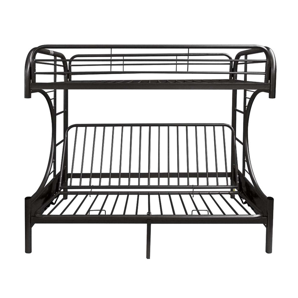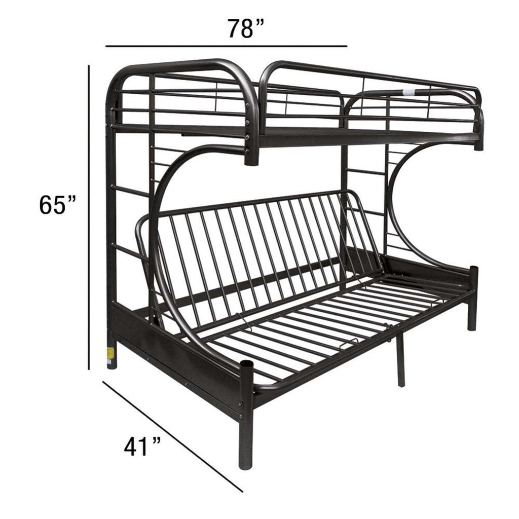 Bring home this Eclipse twin over full-futon bunk bed to let your kids enjoy personal space without compromising on style. The convertible futon feature allows to switch from a sit to sleep position by simply lifting the light weight of the seat; a quick and easy transformation into a ready to use bed. Superior quality metal for durability, built-in side ladders for easy access, and full length guard rails for safety. Choose from a variety of colors, makes it compatible with all types of decor settings. Mattress Not Included.
