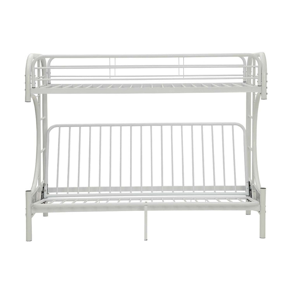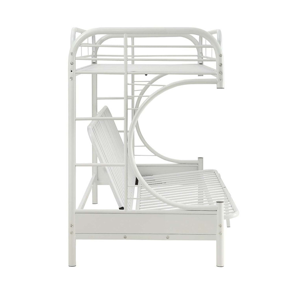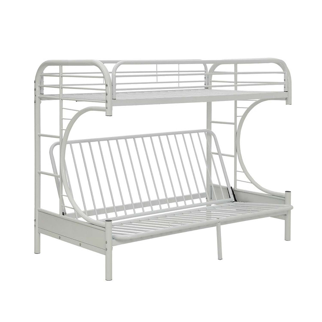 Bring home this Eclipse twin XL over queen-futon bunk bed to let your kids enjoy personal space without compromising on style. The convertible futon feature allows to switch from a sit to sleep position by simply lifting the light weight of the seat; a quick and easy transformation into a ready to use bed. Superior quality metal for durability, built-in side ladders for easy access, and full length guard rails for safety. Choose from a variety of colors, makes it compatible with all types of decor settings. Mattress Not Included.