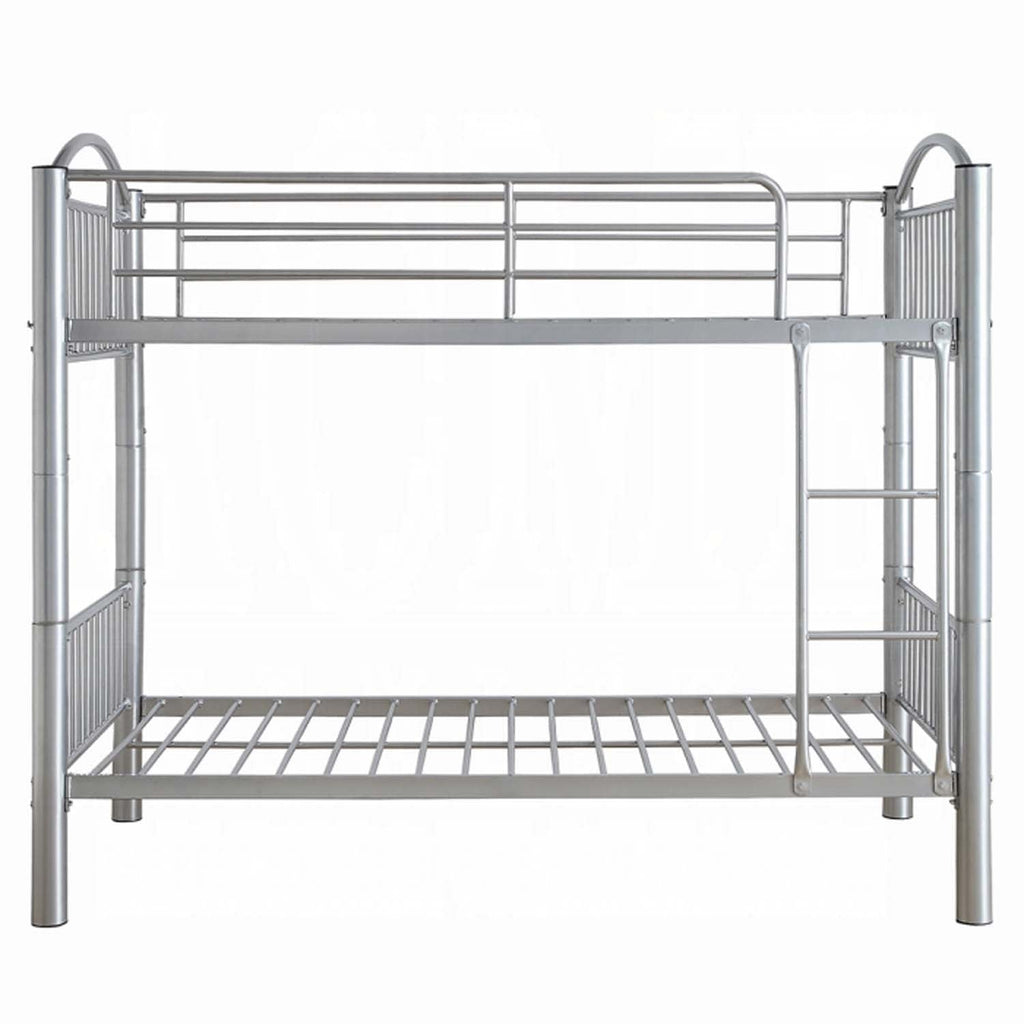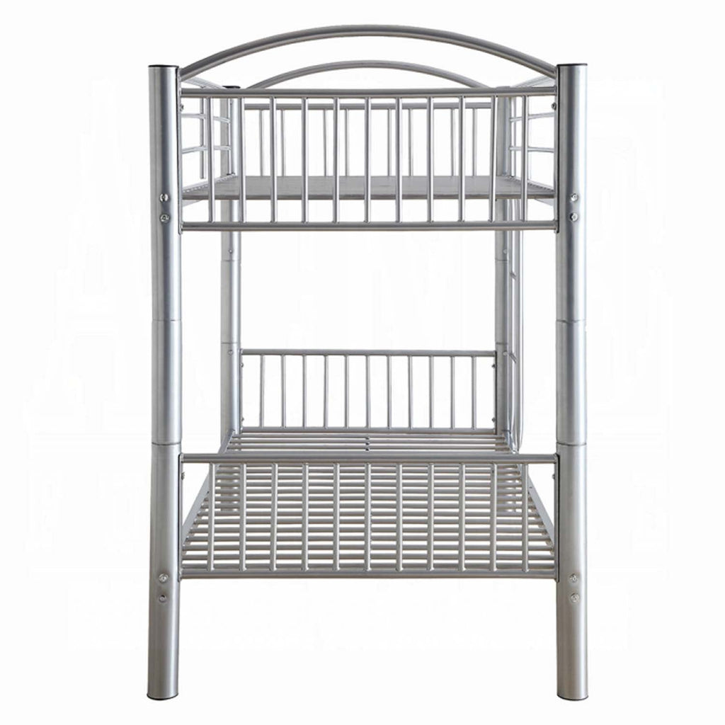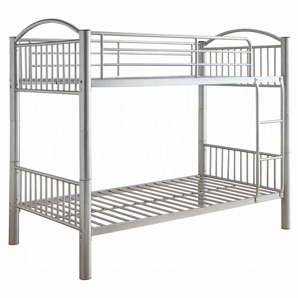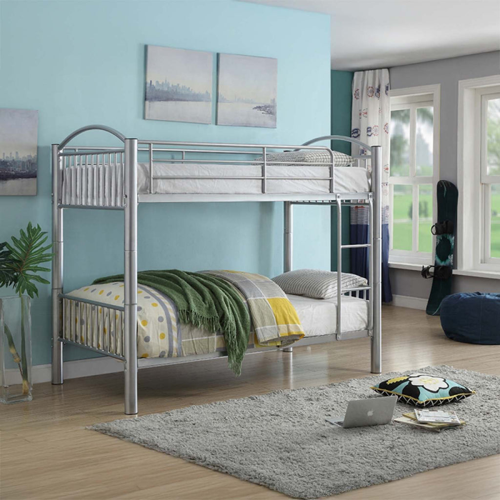The Cayelynn twin over twin bunk bed is a great way to free up space in a kids bedroom. It is a round metal tube design and features a built in ladder to the upper twin bed that also has a guardrail. This bed is available in black and silver.