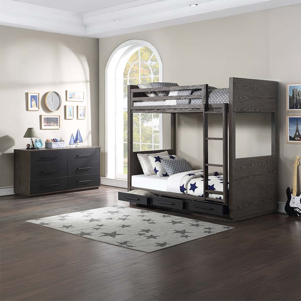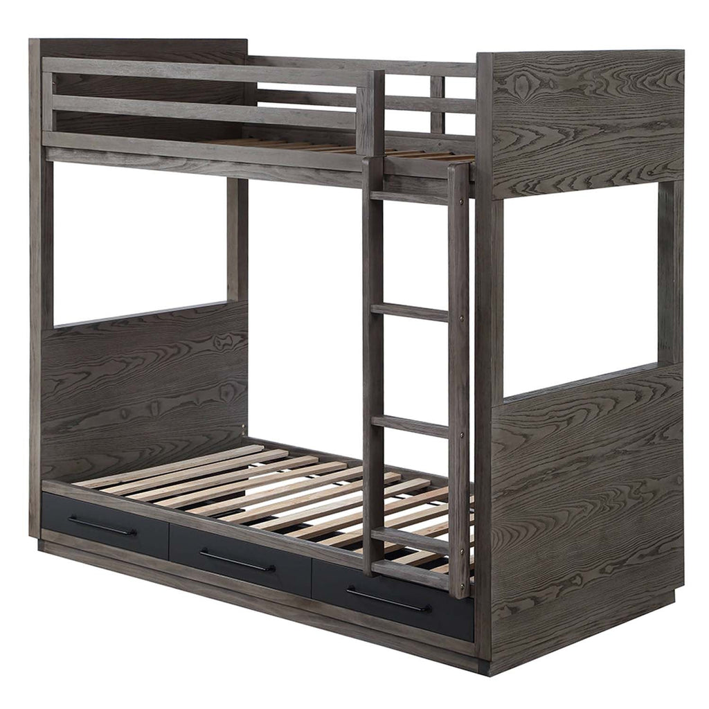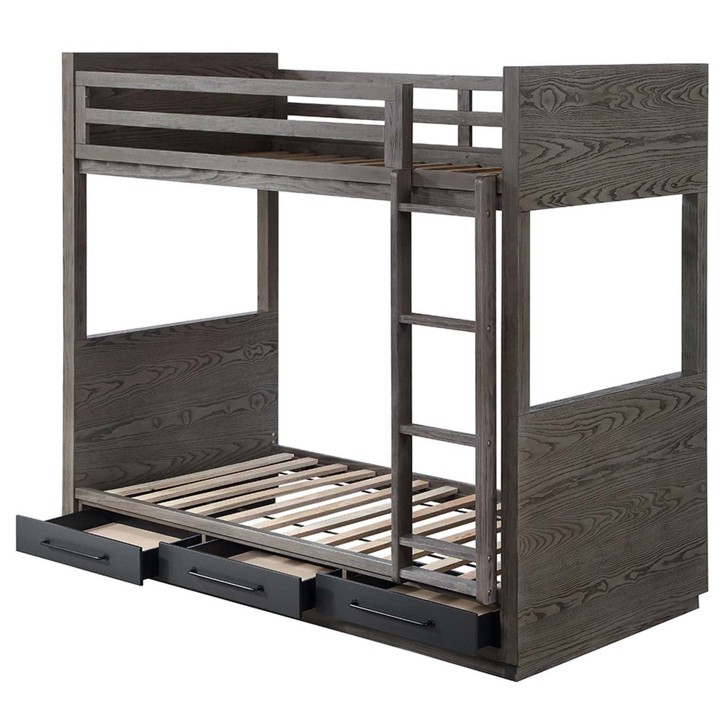 Maximizing the sleeping capacities of your little one's bedroom with the Estevon bunk bed. Whether you've got two children sharing a bedroom or one little one that loves sleepovers, this twin over twin bunk bed is a perfect choice. The gray oak finish is modern and can easily blend in with various color schemes. No need for bunkie boards, the bunk bed includes a 14+14 slat system and a fixed ladder. The bed features three drawers to help your little ones keep organized.