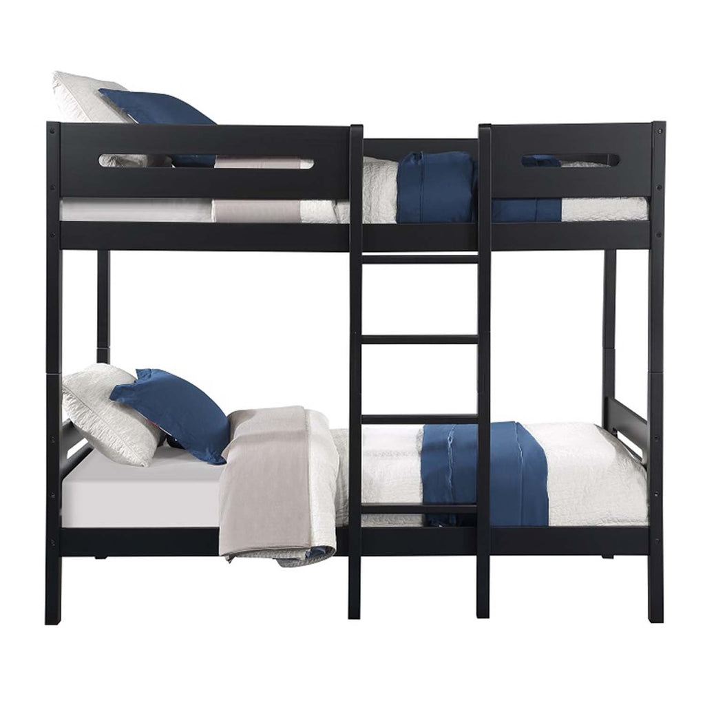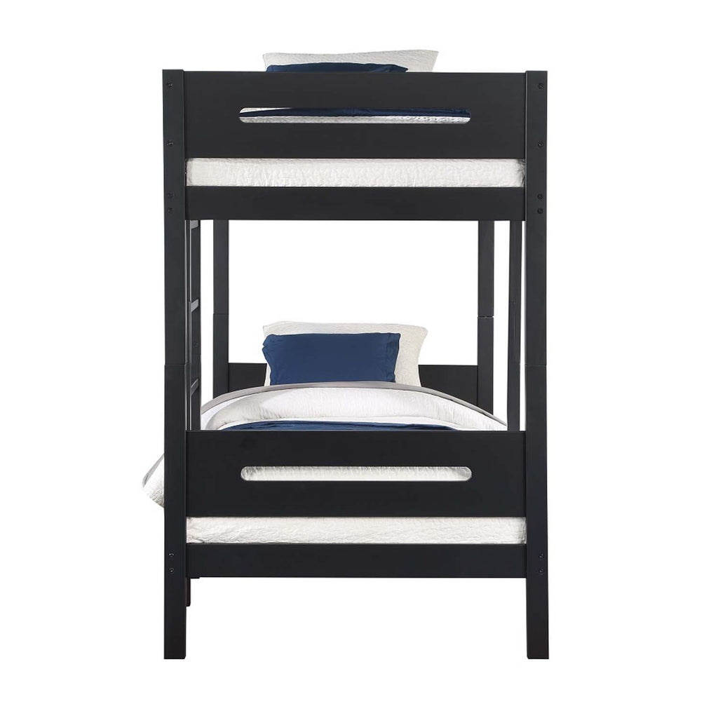 The black Nissa wooden twin-over-twin bunk bed is a stylish and functional addition to any bedroom or shared sleeping space. The bed features a stacked twin-over-twin configuration, allowing for maximum utilization of vertical space while providing two separate sleeping areas. The sturdy wooden ladder is securely attached to the front of the bed, offering easy access to the top bunk. Each sleeping surface is designed to accommodate a standard twin-size mattress, providing comfortable and secure sleep for both occupants. The wooden slats provide excellent mattress support, ensuring a restful night's sleep. Safety is a top priority, and this bunk bed is equipped with sturdy guardrails on the top bunk to prevent accidental falls. The guardrails are carefully integrated into the design, offering both security and peace of mind.