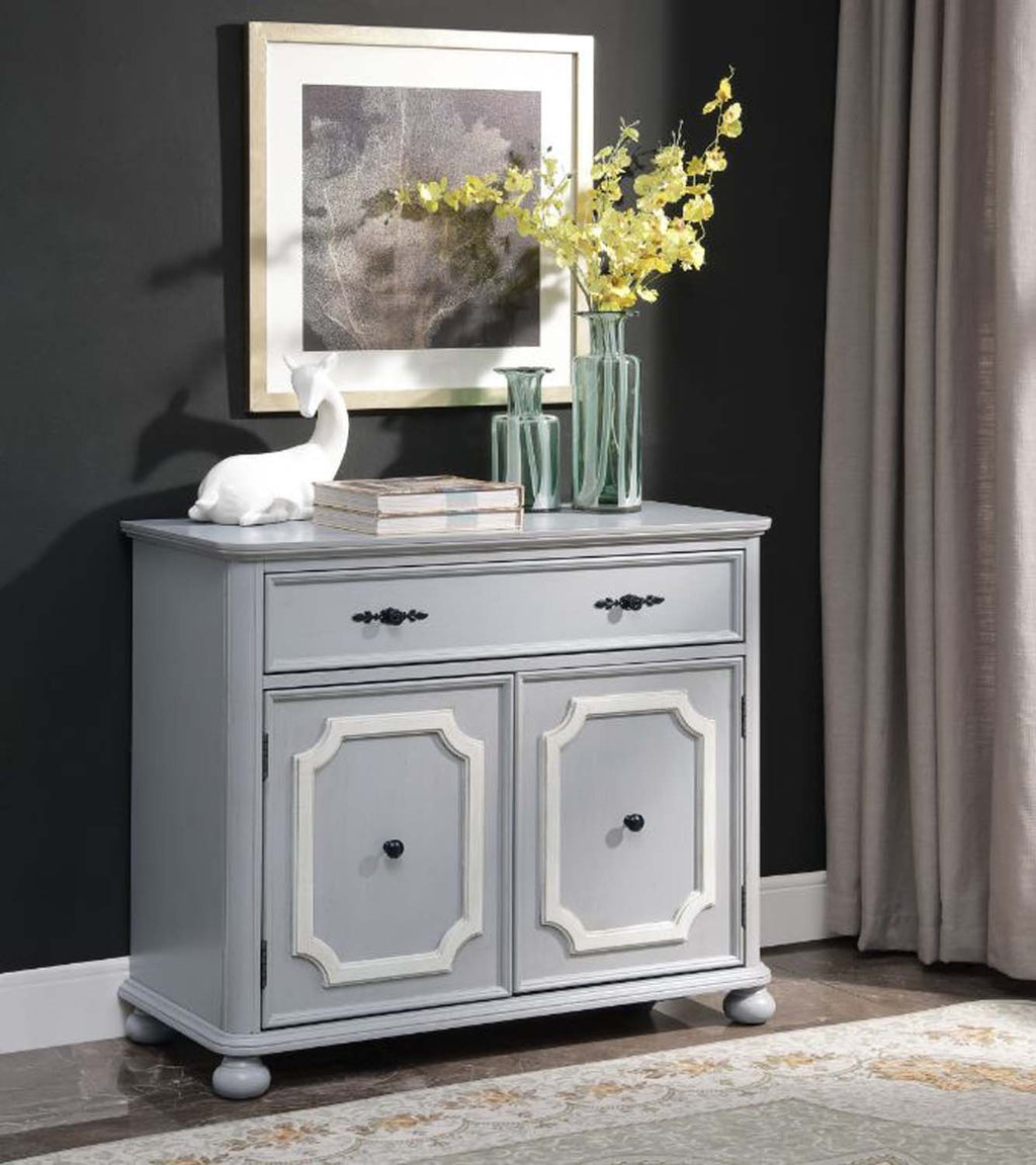 Classic yet a bit romantic, versatile, the Enyin Cabinet,Living Room keeps your space neat, organized, and attractive. Crafted from wood, this Cabinet,Living Room is graced with beautiful wood carving details, while vintage bun feets added to it for elegant support. A muted grey finish softens the sturdy wooden frame, making it blend into any room or decor. The Cabinet,Living Room offers a large drawer and two doors for ample storage spaces. The storage drawer features double floral design knobs with a romantic flair. It is spacious enough to keep all of your personal stuff. Under the drawer is an extra storage space accented by double doors that open to reveal two-tier shelves.