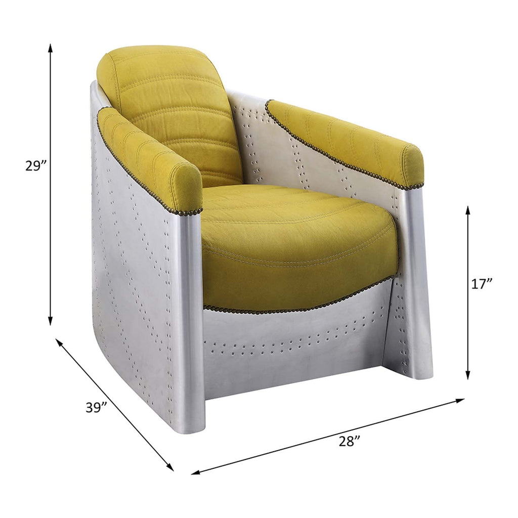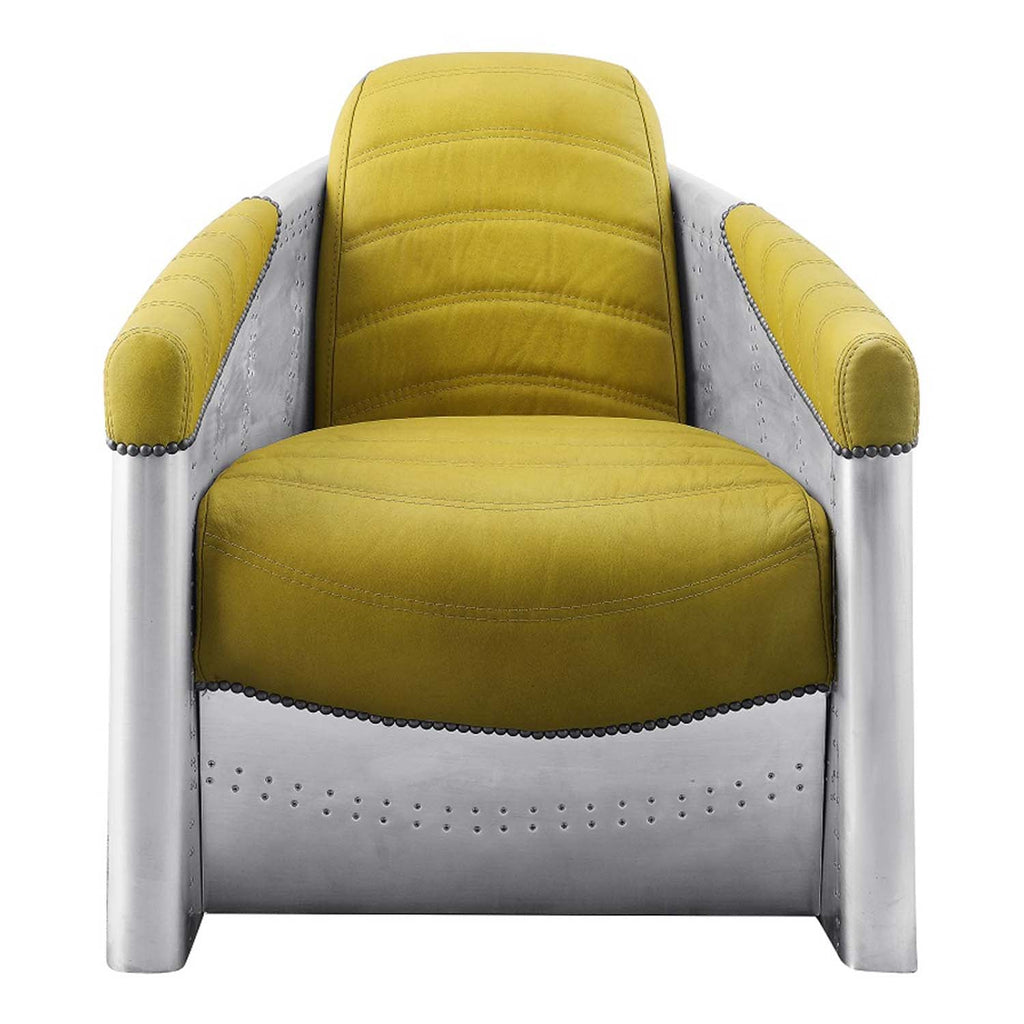 Industrial style gets a radical upgrade in the Brancaster lounge chair in yellow top grain leather. Wrapped in a patchwork aluminum frame with rivet details for that classic Brancaster style, this lounge chair offers innovative comfort with a modified barrel back and sloped armrests that feature padding and nailhead trim. Horizontal decorative stitching along the upholstery adds not only durability but visual interest. The sunny yellow color of this top grain leather lounge chair makes it a bold accent for any room in your home.
