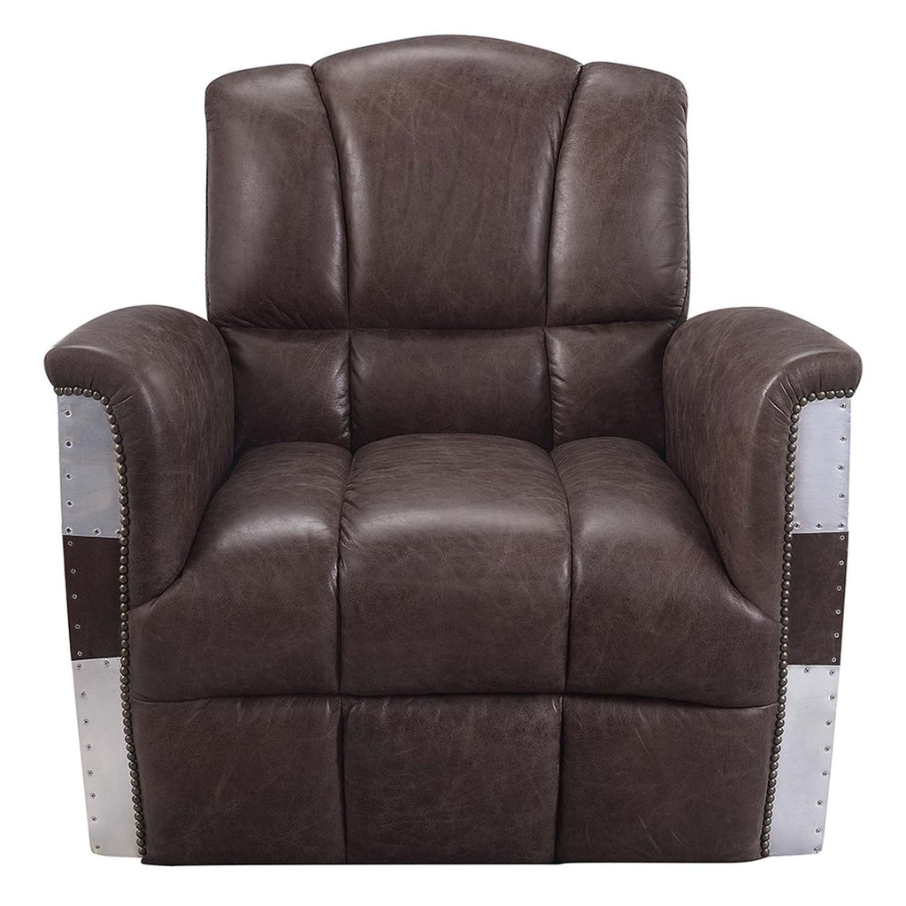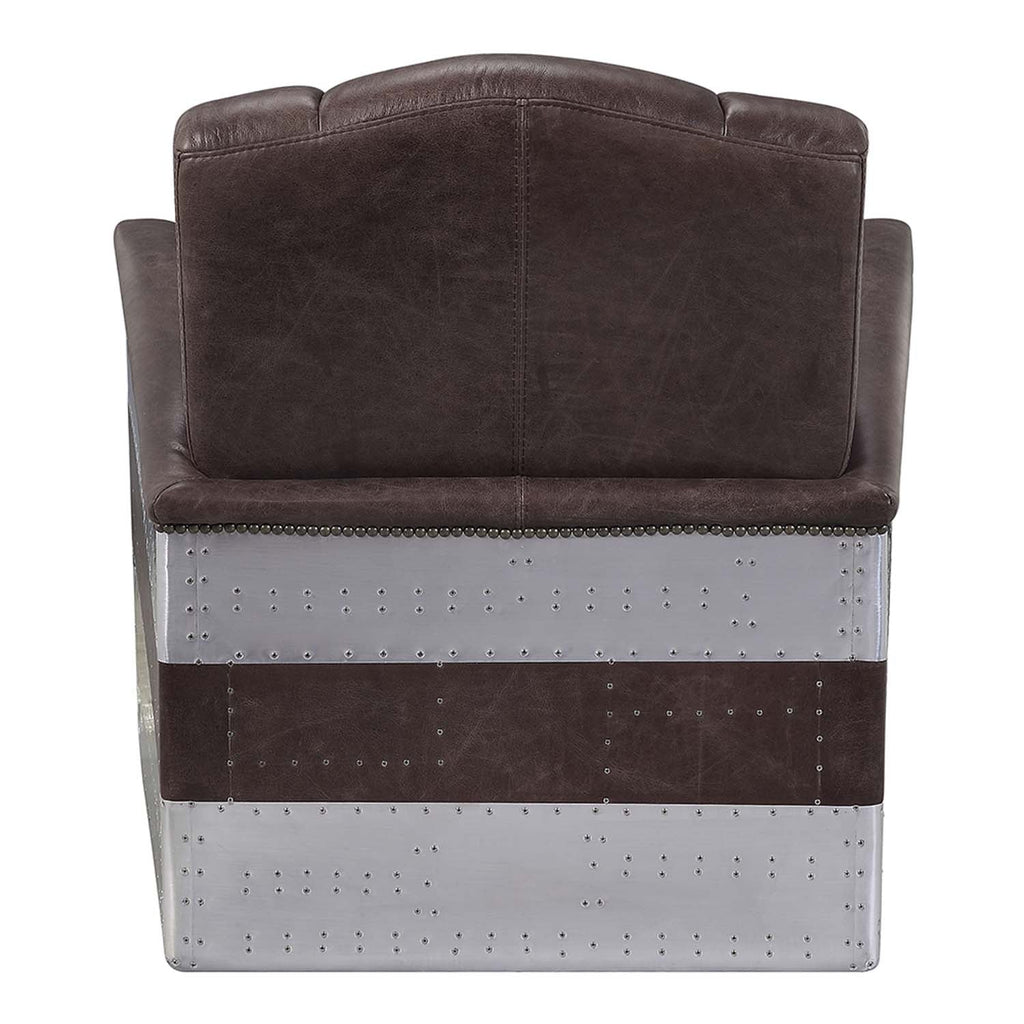 The Brancaster accent chair will be an instant centerpiece to any room. This handsome piece is an excellent update to the traditional club chair. Bold details, such as nail-head trim on the curved armrests, acknowledge its classic roots. To build its look, this large accent chair features an aluminum-wrapped frame detailed with rivets. Top-grain leather upholstery in retro brown graces the full foam seating.