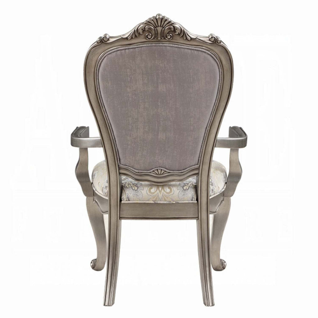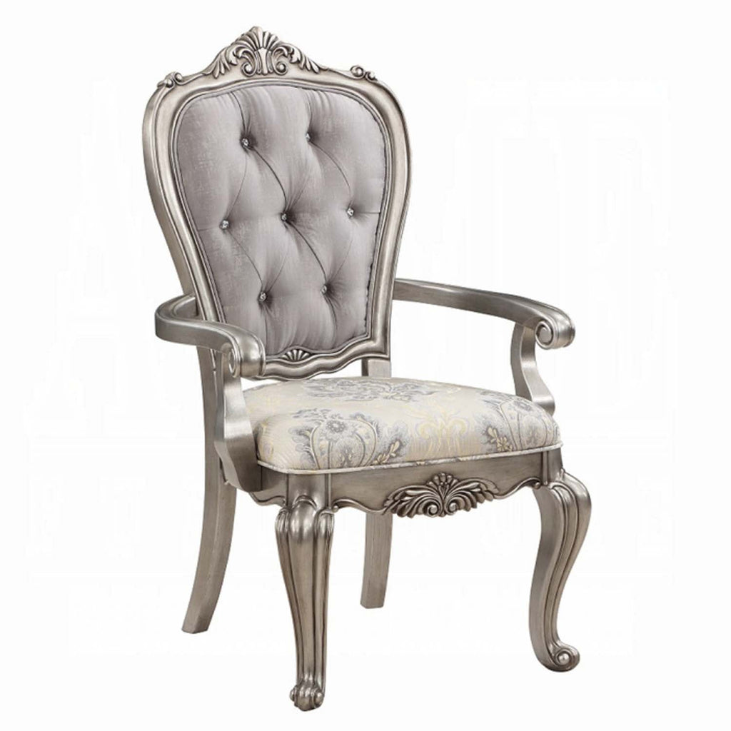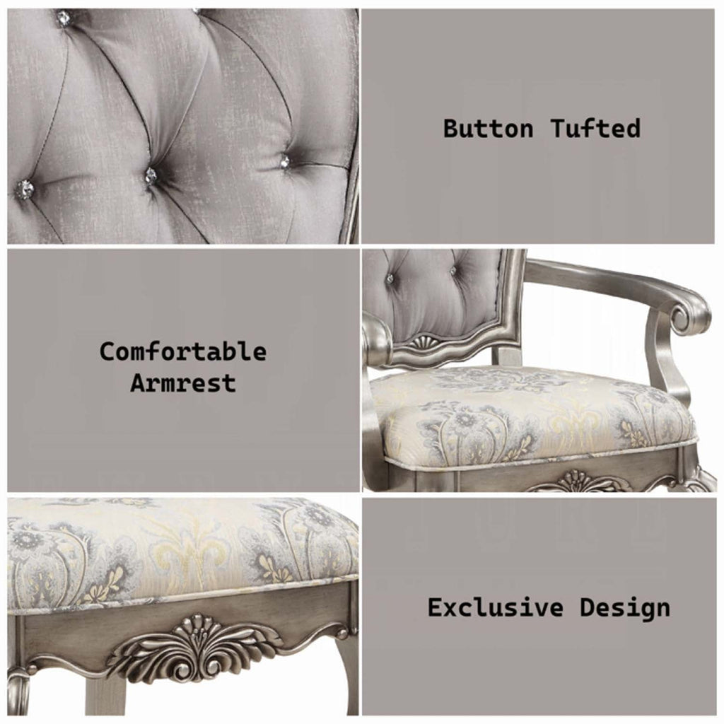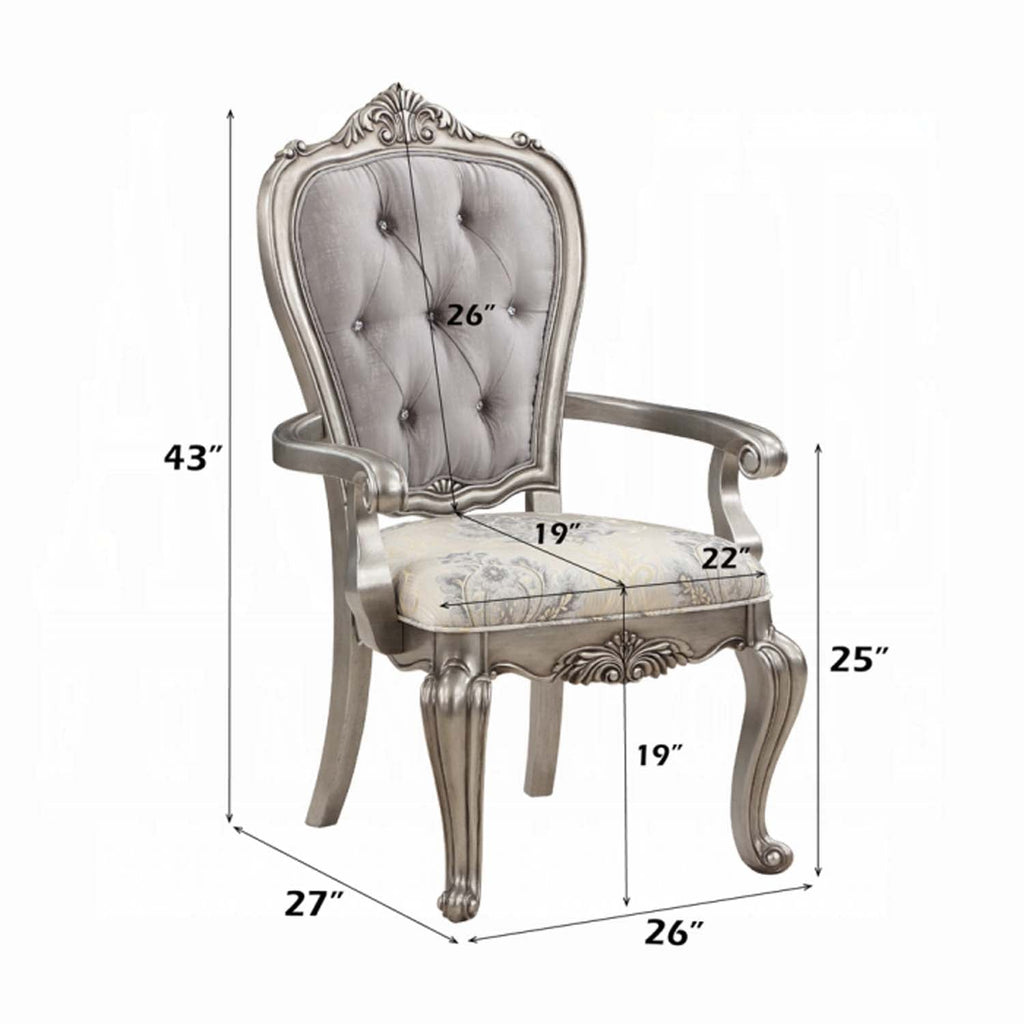 Introducing our Ariadne armchairs that are sure to captivate you with their intricate scrollwork and luxurious antique platinum finish. These stunning dining chairs have beautifully crafted scroll legs that make a grand statement on their own. Adorned with a subtle crown on the top of the frame and finished with crystal-like buttons on the backrest for visual appeal. The foam seat cushion creates the perfect set for your dinner guests to enjoy a nice meal.
