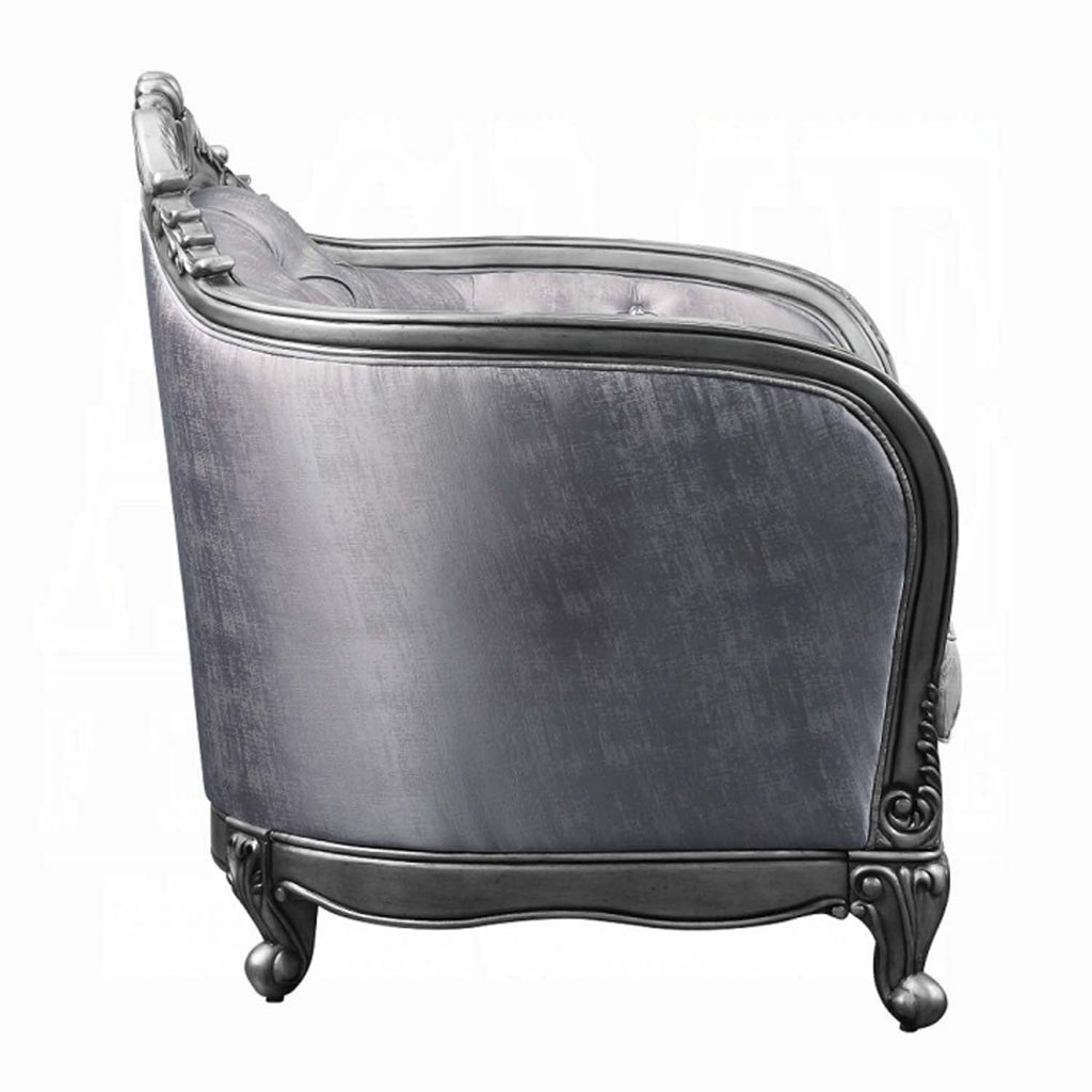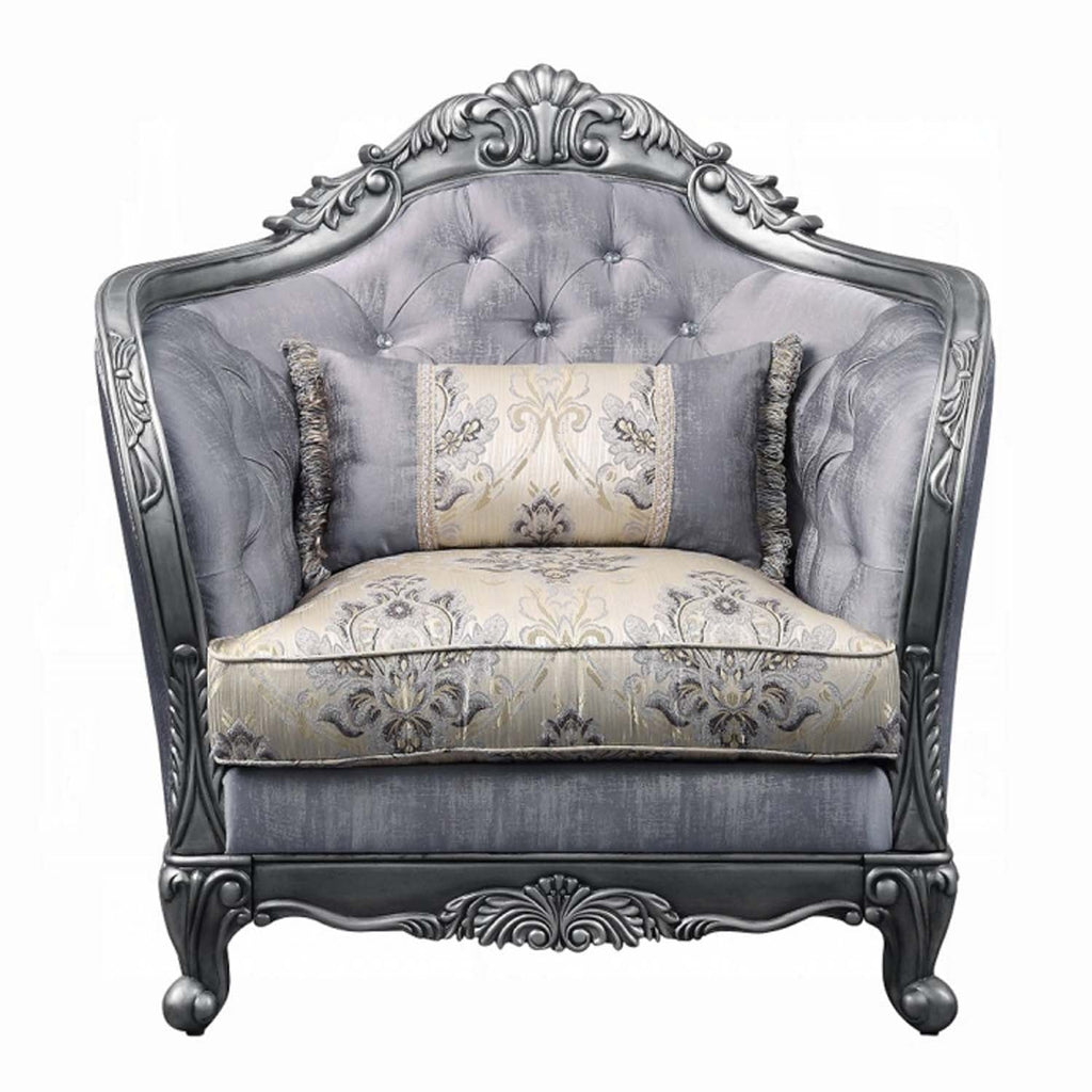 The Ariadne chair is fit for royalty! The platinum finish of the wooden frame complements the lustrous upholstery over button-tufted seatback and armrests. Carved flourishes crown the arched seatbacks and extend down the molding around the high shelter armrests. Accent pillow with floral patterns are included.