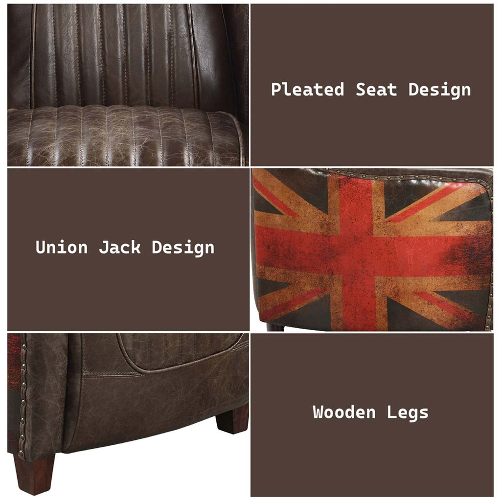 Our famous Brancaster collection now includes a Union Jack-printed chair. It is made from high-quality top-grain leather that will withstand years of use. The weathered effect makes the pieces look well-loved and inviting. Wooden feet and an inner frame make for a sturdy piece. The channel stitching on the backrest and seat adds visual interest. It is adorned with rivets on the outer edges for an industrial touch. The full foam seating is plush and creates a relaxing seat for you to unwind for hours on end.