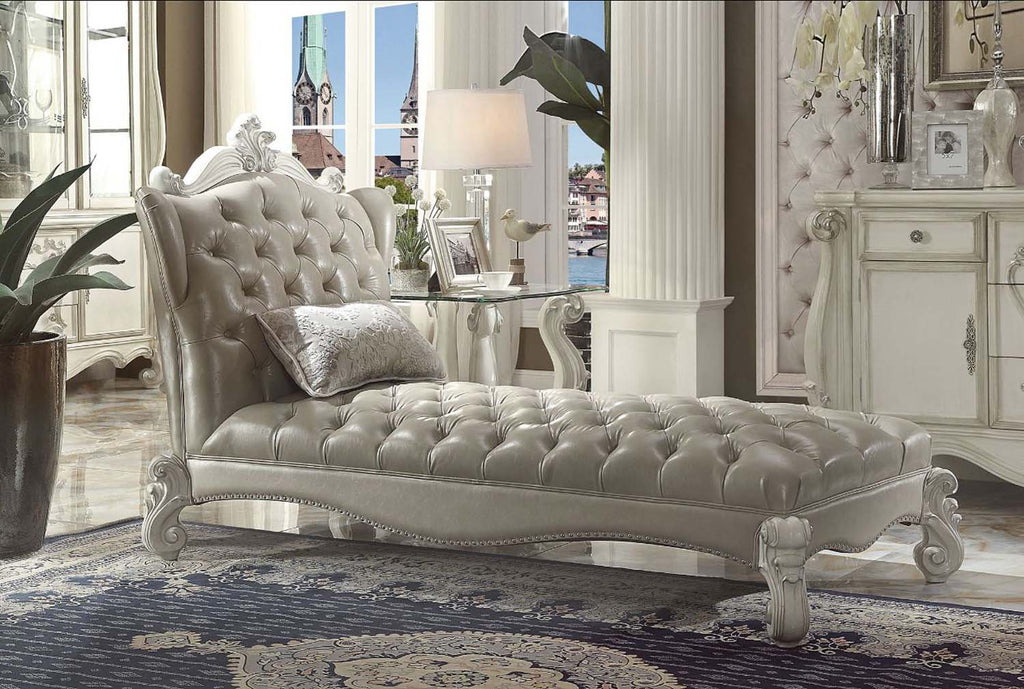 Create an elegant, traditional design in your room with the Versailles Chaise. A hand-crafted piece inspired from the luxurious designs of the past, this stunning piece comes in a bone white finish and features a vintage gray PU button-tufted back and seat with gray accent pillow. Elaborate carving detail along its wood legs and sides add to its sophisticated style. Introduce a collection of timeless taste and appearance to your room's Decor with an upholstered chaise that will make any home feel refined and comforting.'