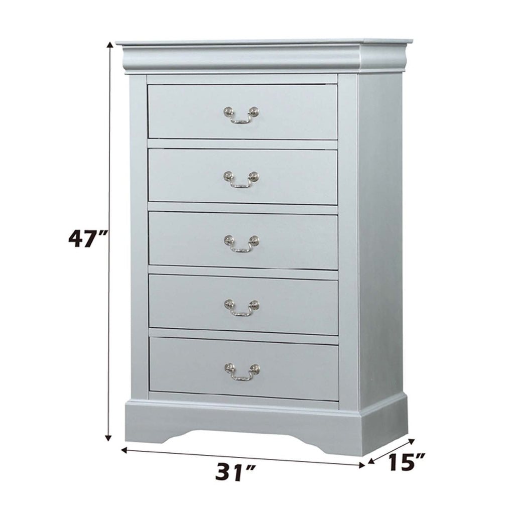 Bring casual elegance into your home with the Louis Phillipe chest. This chest is a piece that offers any bedroom a sophisticated look. Finished in classic finish with metal hardware, the simple moldings and luxurious pull handles add subtle style and appealing detail to each piece.