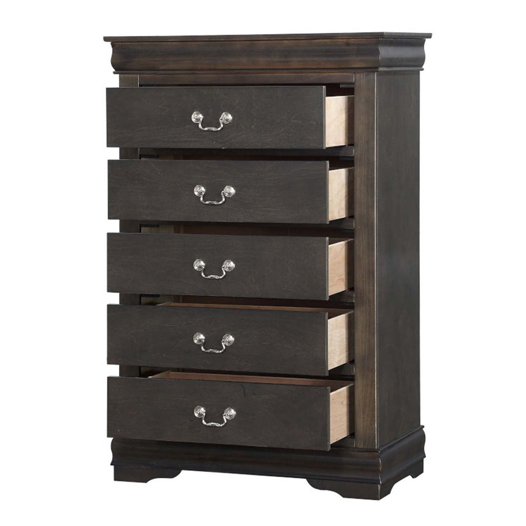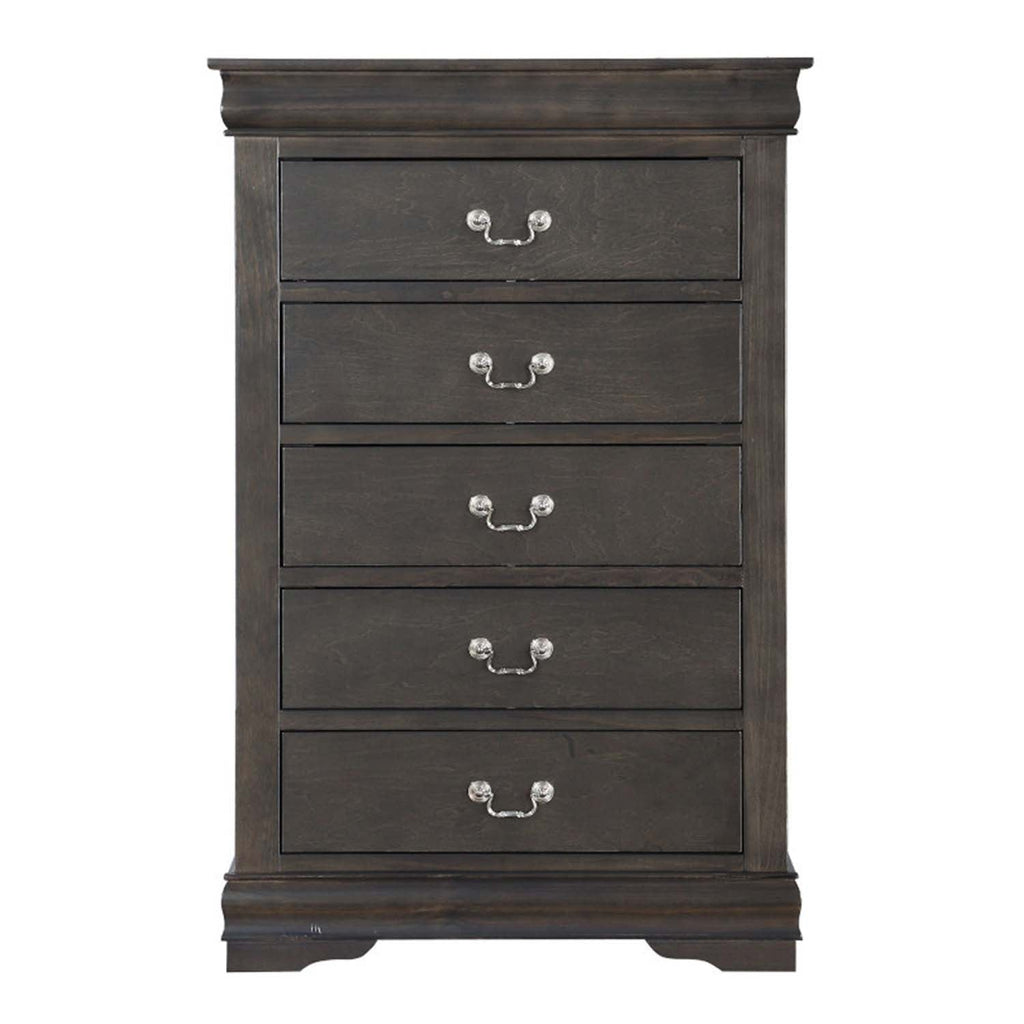 Bring casual elegance into your home with the Louis Phillipe bedroom collection. This five drawers chest offers any bedroom a sophisticated look. Finished in classic finish with metal hardware, the simple moldings and luxurious pull handles add subtle style and appealing detail to each piece.