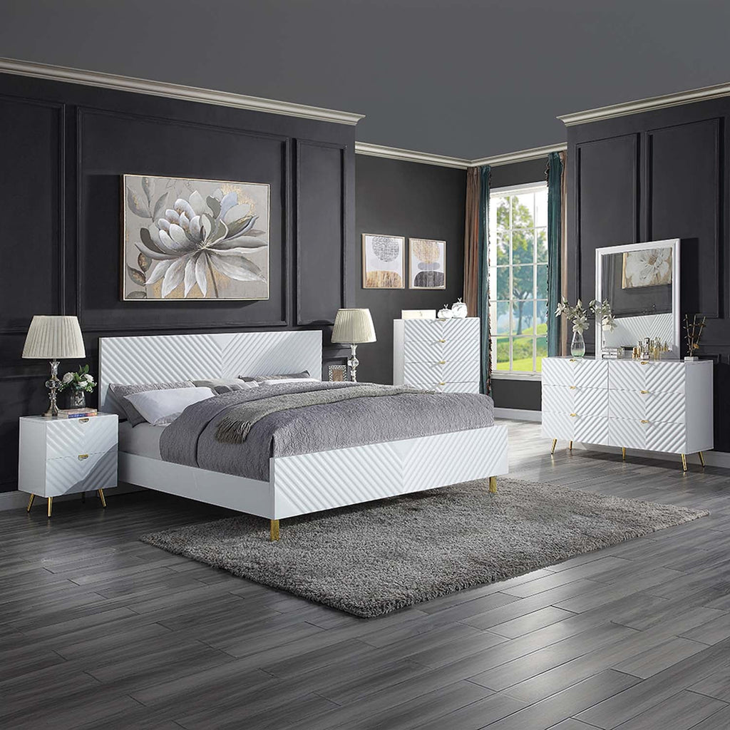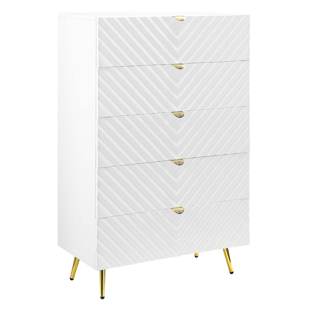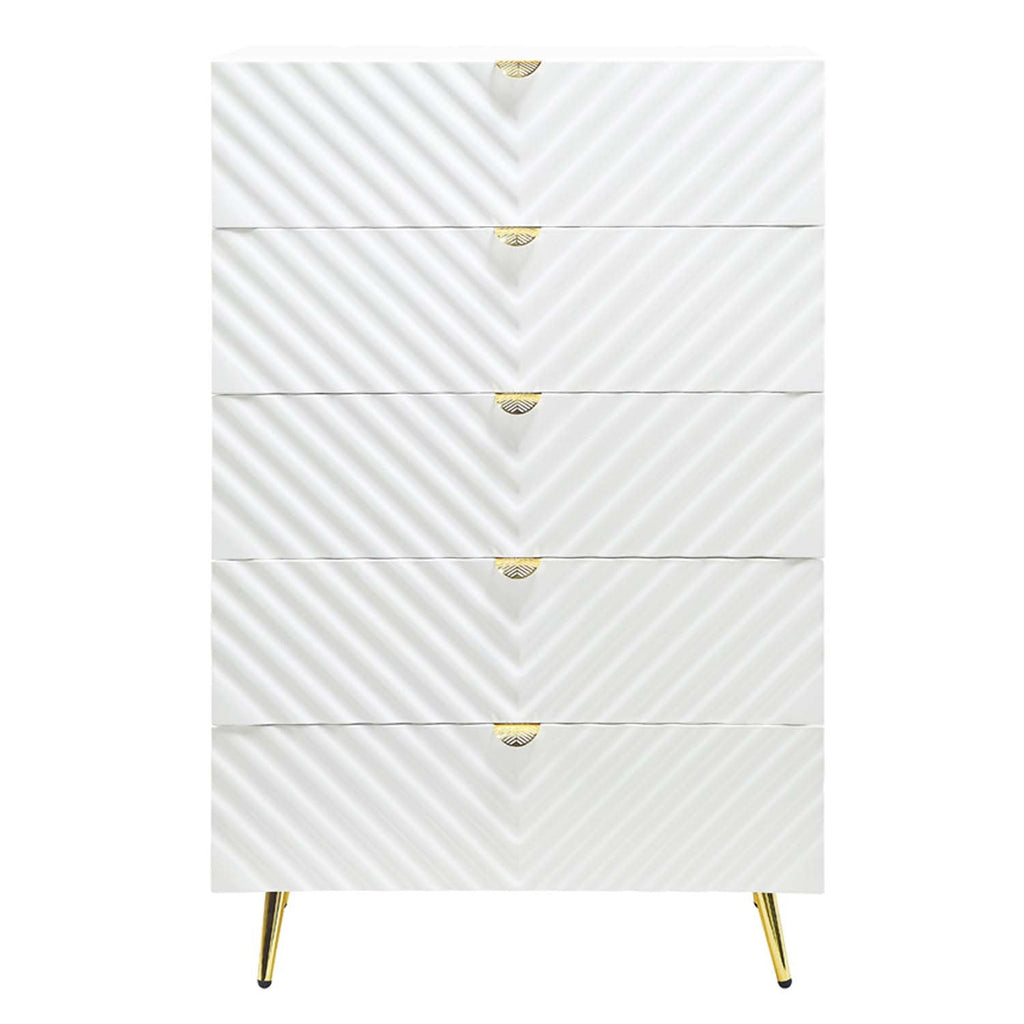 The Gaines Collection is a glamorous and sophisticated grouping that adds a chic style to any room. The white gloss finish and gold metal accents help to accentuate the clean lines of the pieces and add a pop of glamour. The diagonal line design adds visual interest and texture, making each piece stylish. With a variety of storage options to meet your needs.