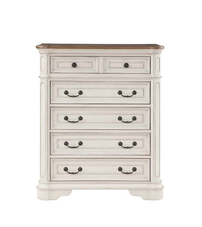 Classic design elements never go out of style the Florian chest is designed for the traditional home. The antique white finish gives off the right amount of distressing for a worn-in feel. The drawer fronts have raised panels to add visual interest. Offering a natural wooden finish top for contrast against the antique white finish frame. The drawers are full-extension and offer French dovetail fronts and English dovetail back construction. Comfortable, timeless, and stylish, this chest will bring a strong design presence to a room.