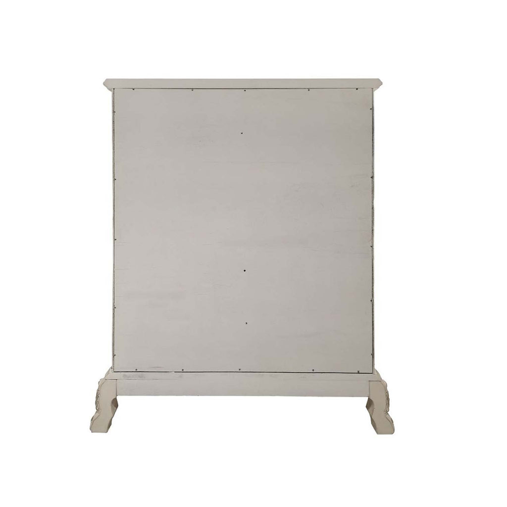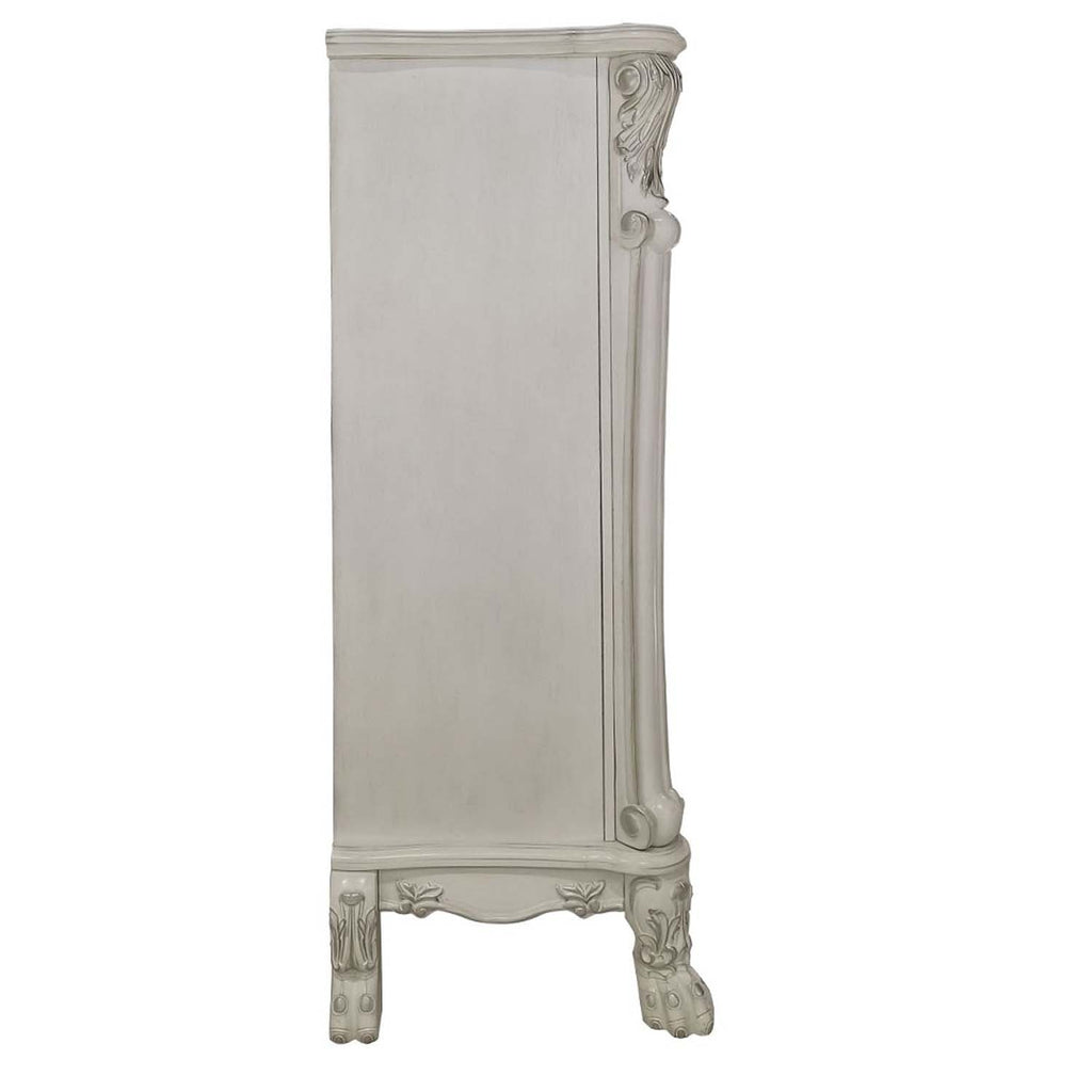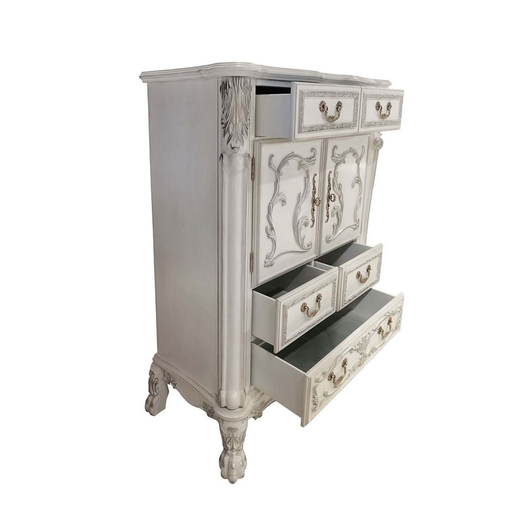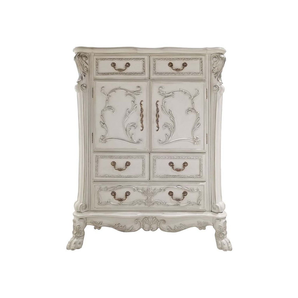 The Dresden II chest is exclusively designed and filled with a romantic spirit that will transport you to regal times. The piece is crafted and inspired by the luxurious designs of the past, this gorgeous piece features five drawers with French dovetail construction with felt lining and a center double-door cabinet space. Expertly detailed, this gorgeous chest highlights elaborate carvings on its frame. This chest is finished in an elegant bone white with hand-brushed silver accents and sits on elegant claw feet.