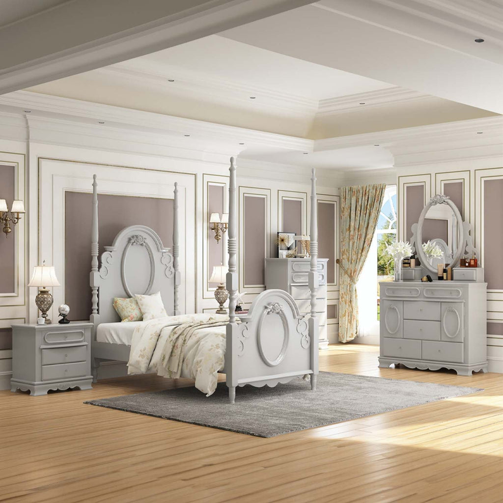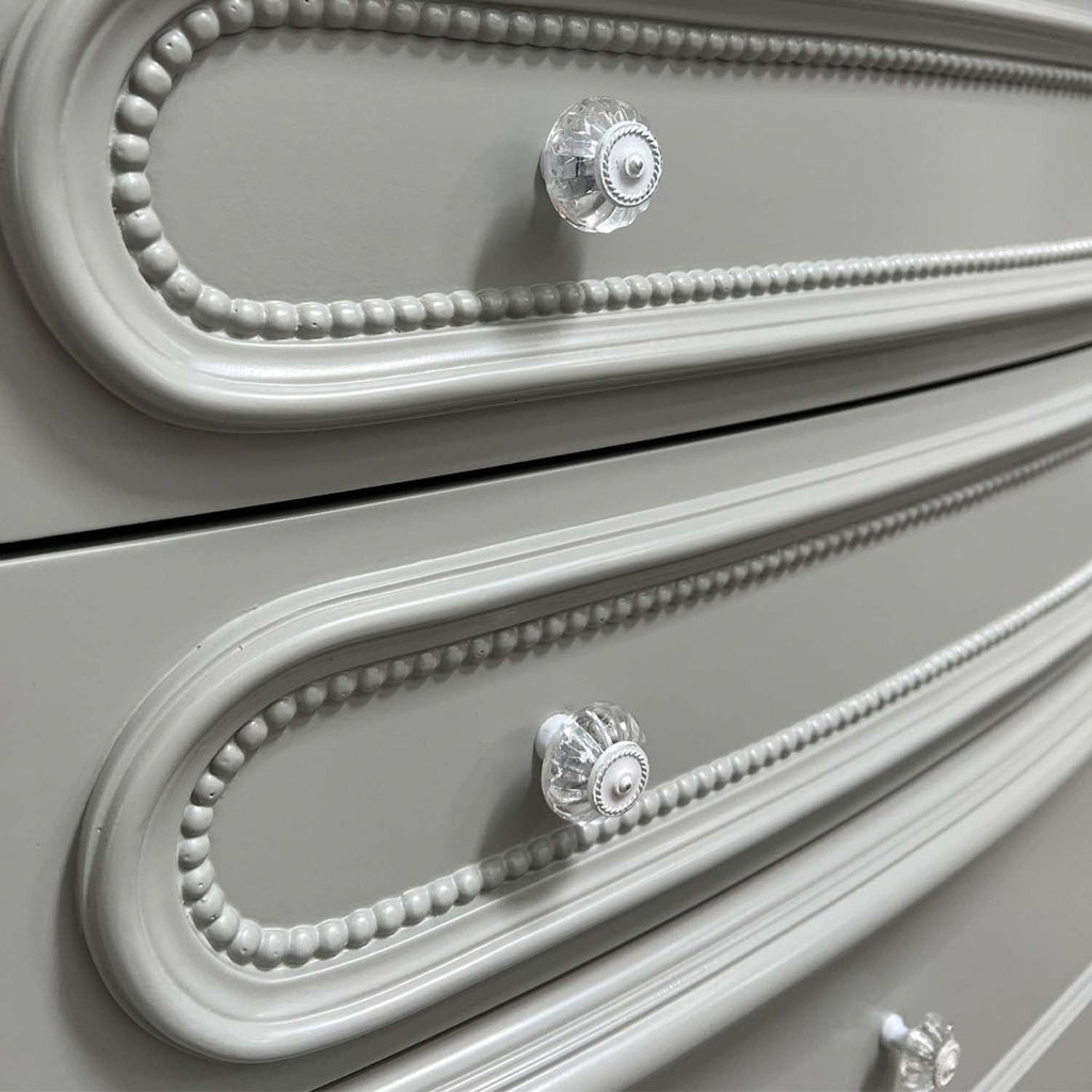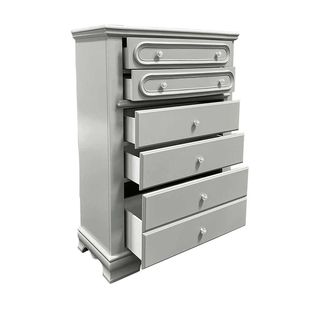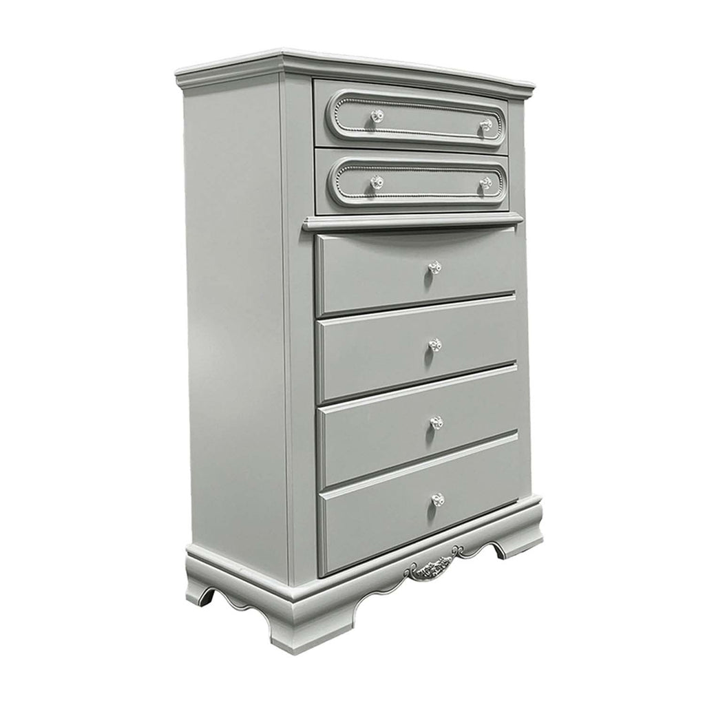 Fulfill your little girl's dream of being a princess by creating a royal retreat with the Flora chest. This frilly chest features a scalloped base with a beautiful floral motif detail for an added girly touch. Its six drawers ensure there is enough storage for all their ballgowns and accessories. The gray finish is perfect for a modern princess. This chest is sure to make your little one beam with happiness.