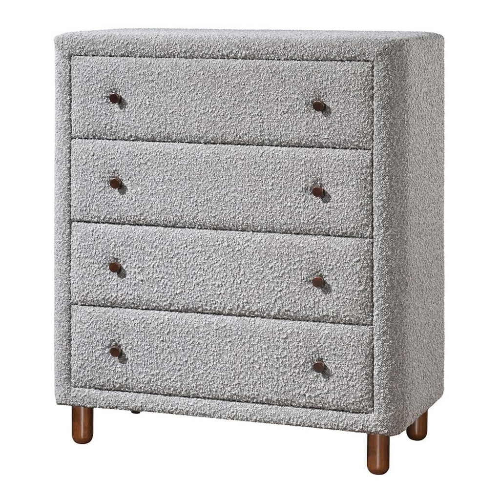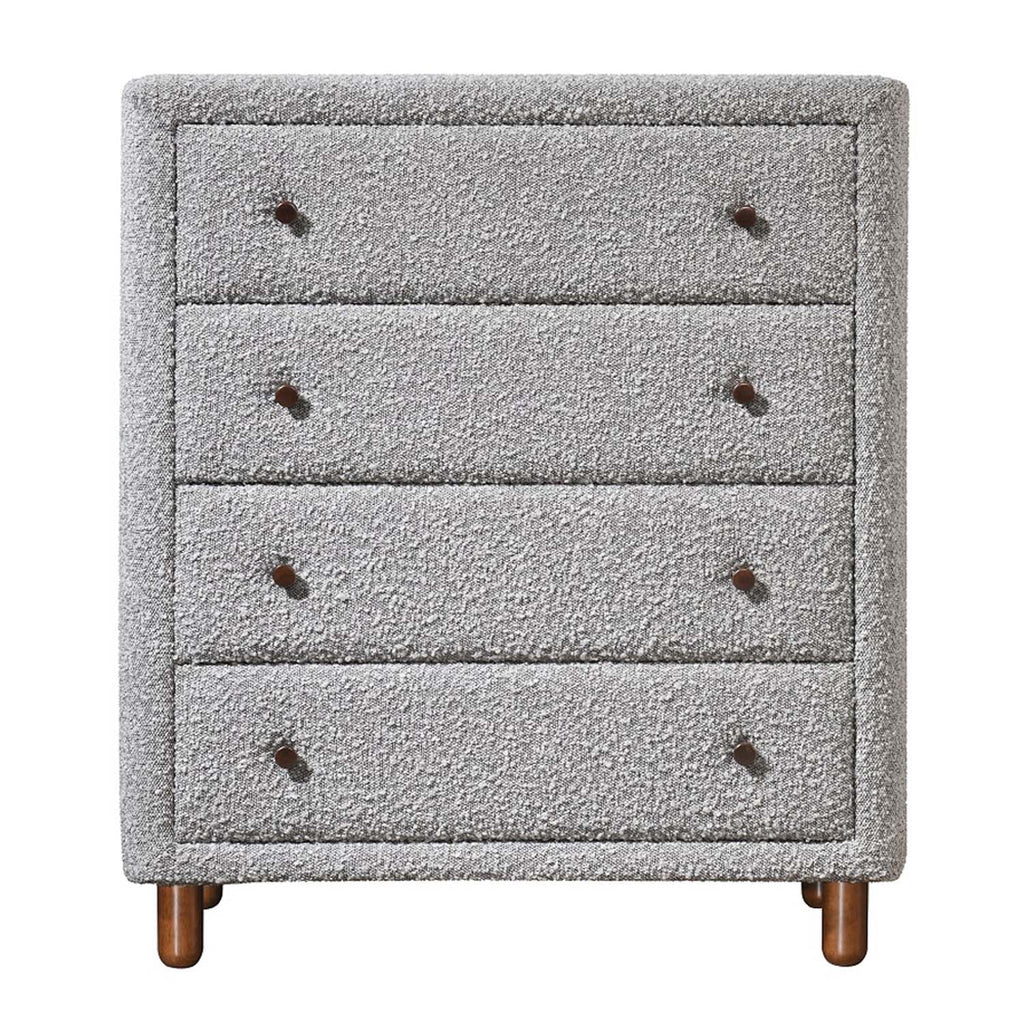 The classic design of the Cleo chest gets a chic update in a textured boucle fabrication, perfect for adding a whimsical touch to your bedroom. The ches'ts softly curved frame softens the overall look of this design while injecting a dash of trendy allure. This chest mixes mid-century minimalism with plush boucle upholstery and wooden legs. The four drawers provide plenty of storage space for clothes, helping you keep an organized room.