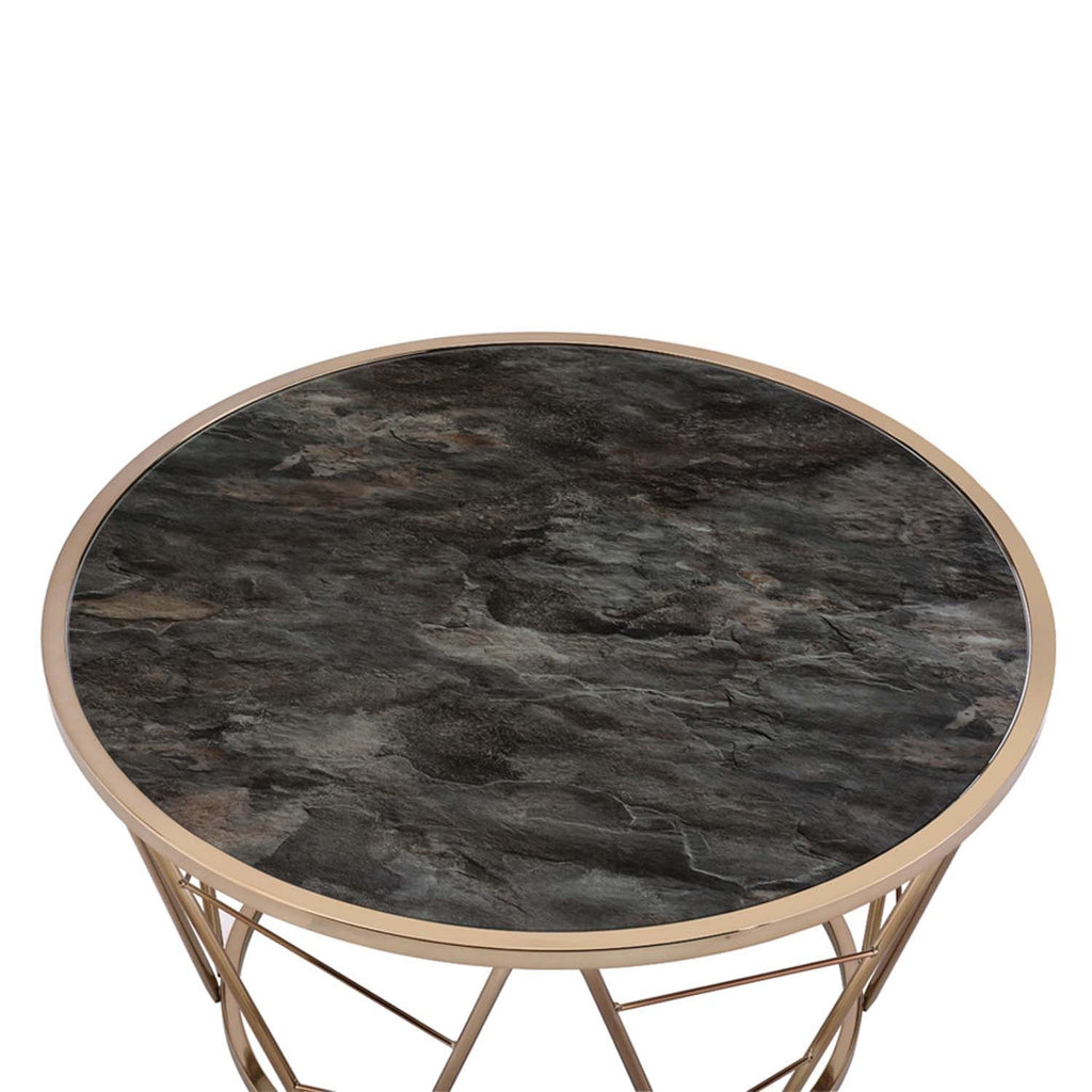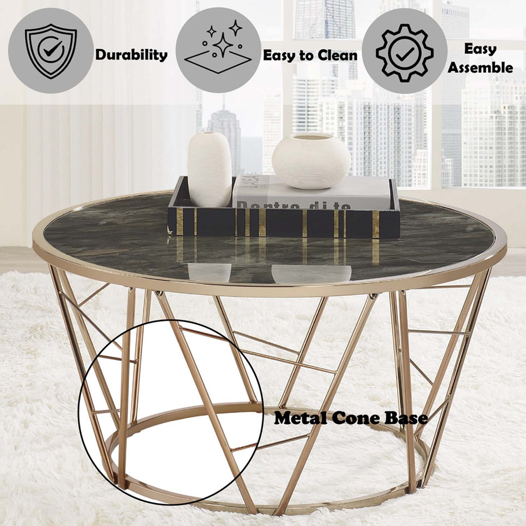 Clean lines and sleek finish make this alluring accessory fit seamlessly into any design style. Strong-lined triangle accent on its base is modern and attractive, making a beautiful contrast to the softer circular table top. Champagne gold finish and faux black marble highlight each other brilliantly, making your space feel energized and complete. With rich tones and modern accent, the Cicatrix Coffee Table will create a balance and harmony in the room.