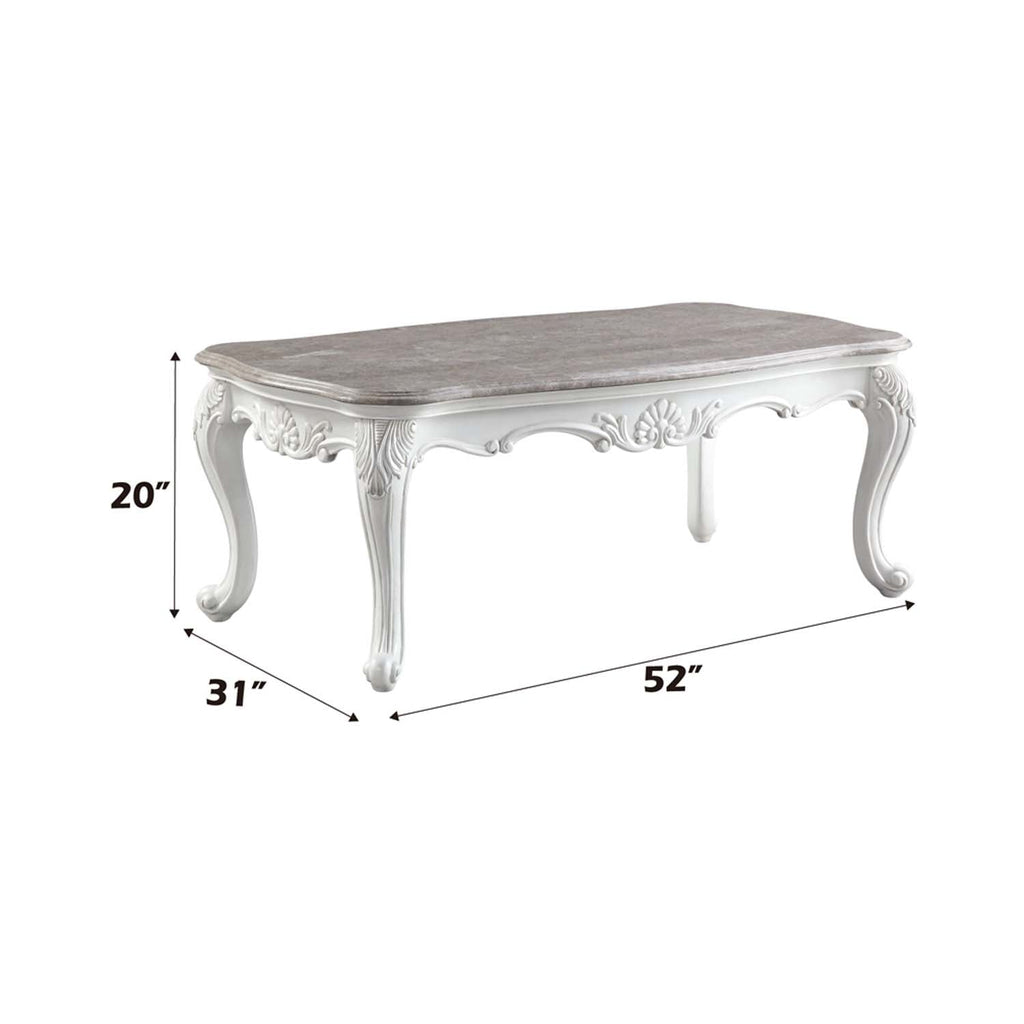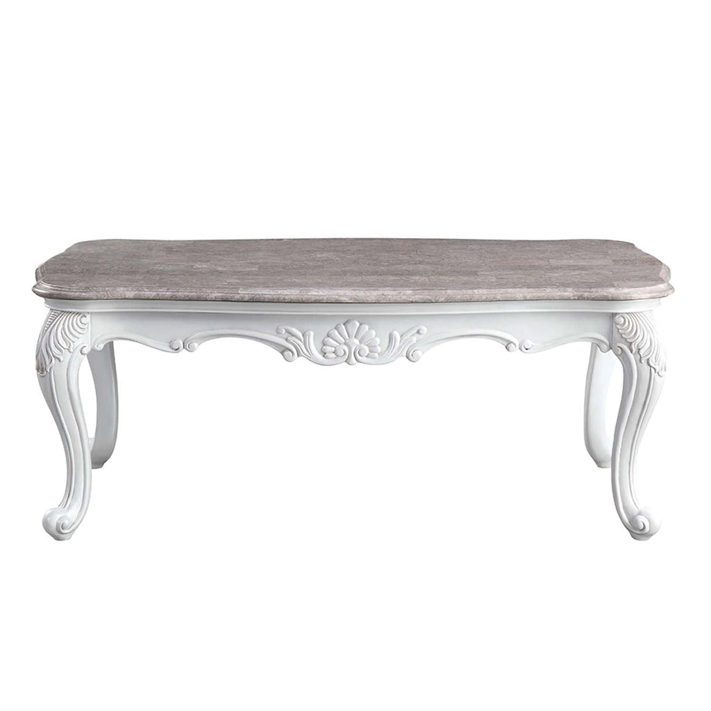 Showcase your refined decor style with the Ciddrenar coffee table. This rectangular coffee table exudes refined elegance and looks great with traditional or Old-World style decor. Traditional design elements with classic details such as intricately carved moldings on the apron and legs. The exquisite marble top is perfectly complemented with a classic white finish wooden base. Pair this coffee table with its matching sofa or end tables for a seamless look.