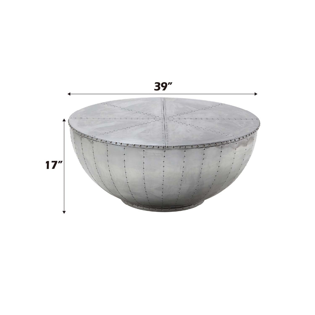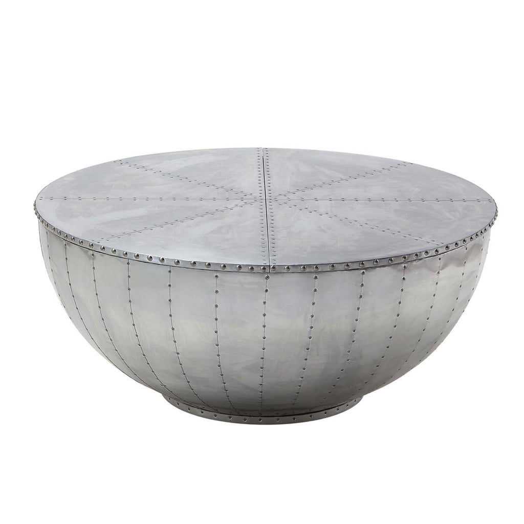 Looking for cutting-edge style? The industrial Brancaster round coffee table is the perfect conversation piece. With features like aluminum patchwork with rich overtones and convenient, discrete storage, this unusual coffee table is sure to impress.