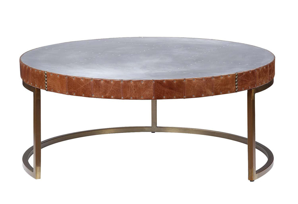 Enhance the modern vibe of your living room with the Tamas round coffee table. Its slender metal base is artfully curved to add style, and the aluminum patchwork table top provides a durable surface for piping hot or ice-cold beverages. The apron is wrapped in smooth top grain leather in a beautiful cocoa color for the perfect accent.