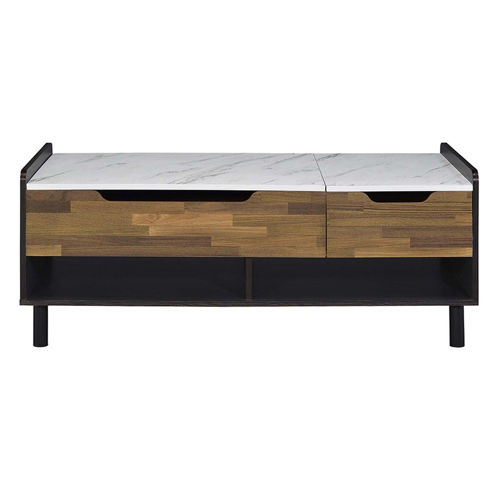 The Collection coffee table's innovative design with a hidden compartment and lift tabletop can be adjusted vertically to make things more convenient. Lifting it is effortless, there is an extra storage room provided. The coffee table includes a side drawer for extra storage. Complement your home decor with this modern accent piece since the clean lines work in close collaboration with convenience in this functional design, which is finished in oak and faux marble.