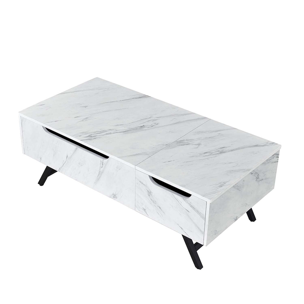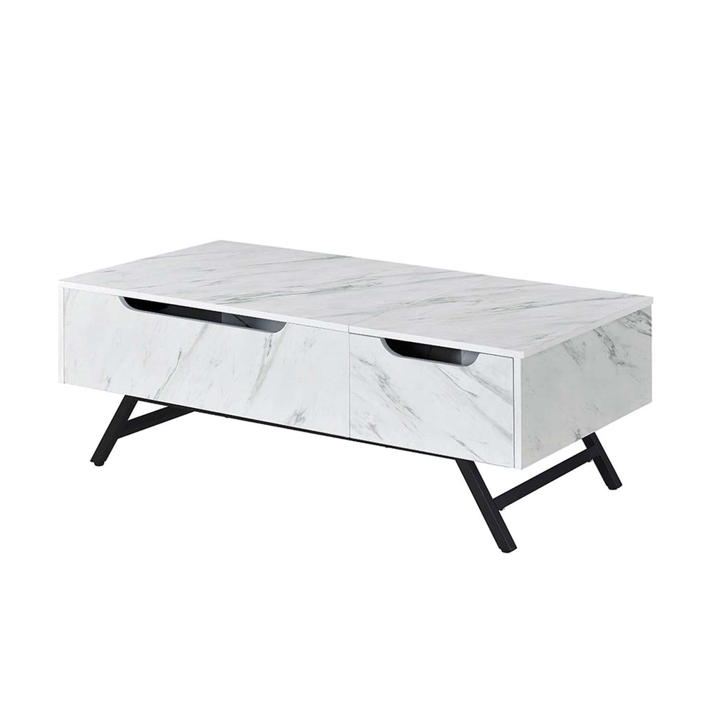 Never leave your couch again. Give your home a distinguished new look with this Throm faux marble lift-top coffee table. This coffee table offers a spacious surface that conveniently lifts for the ideal multipurpose workspace for you to work from home, surf the web on your laptop, or munch on snacks while relaxing from the comfort of your couch. Underneath the handy lift-top surface is hidden storage for you to stow away home essentials, spare blankets, or board games. Use the side drawer to store any other items you typically wouldn't want your guests to see.