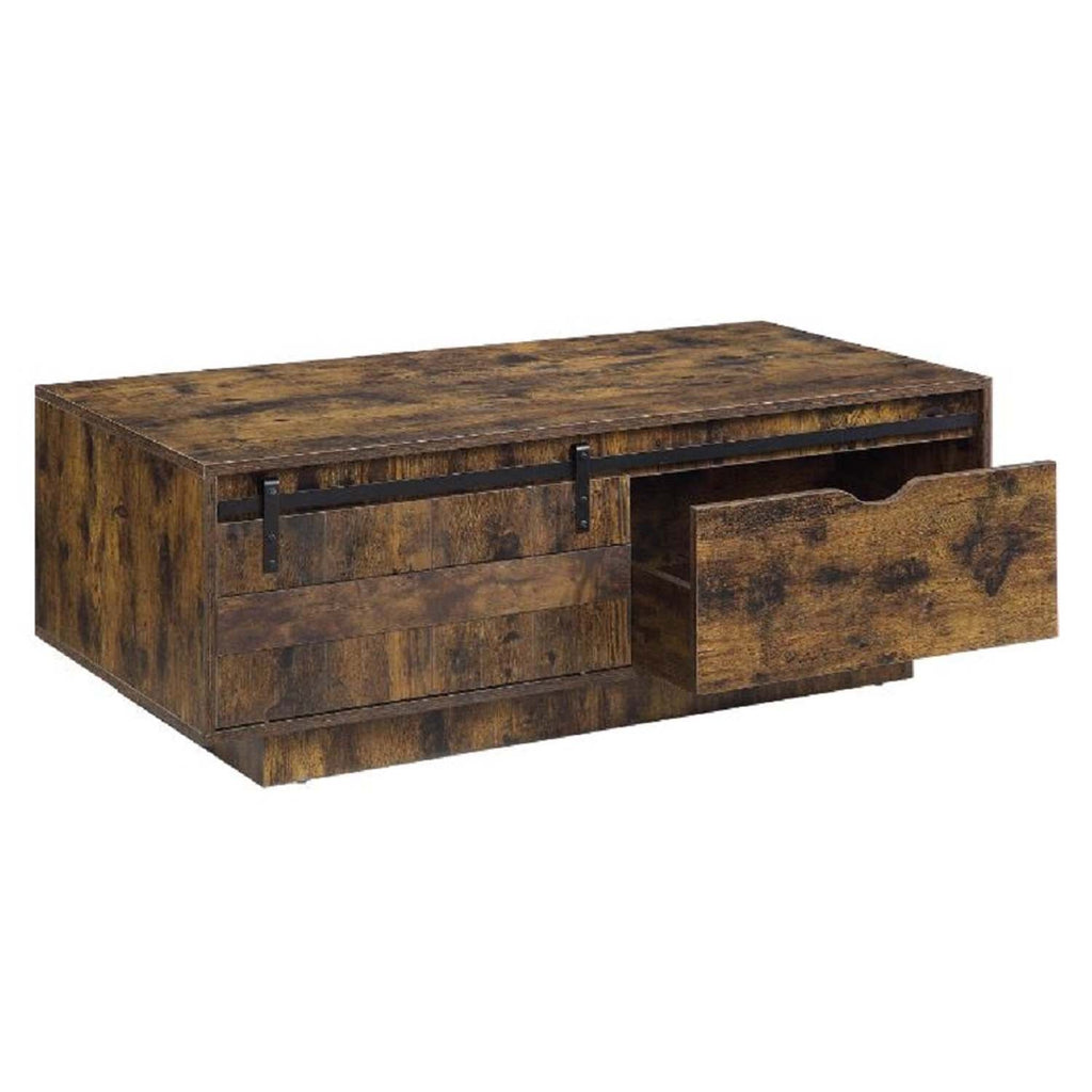 This versatile Bellarosa storage coffee table raises the standard of modern farmhouse design. It features a rustic oak finish with a sliding barn door that opens to reveal plenty of room for board games and books. Features a spacious drawer that can be used to store blankets and remotes. This coffee table is constructed from engineered wood with black metal accents that add an extra layer of rustic charm to your living room or family den. On the surface, it features lots of room for a vase of fresh flowers and a set of coasters.