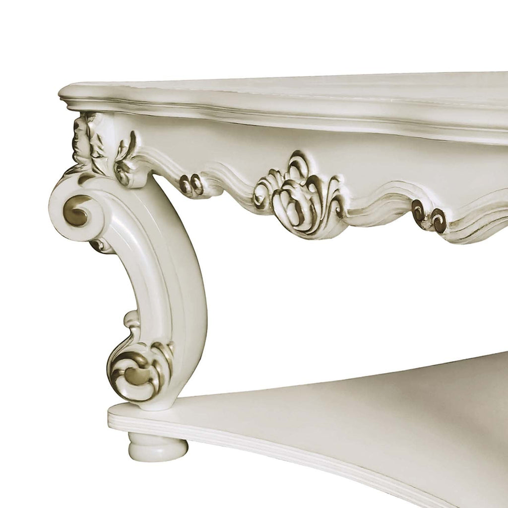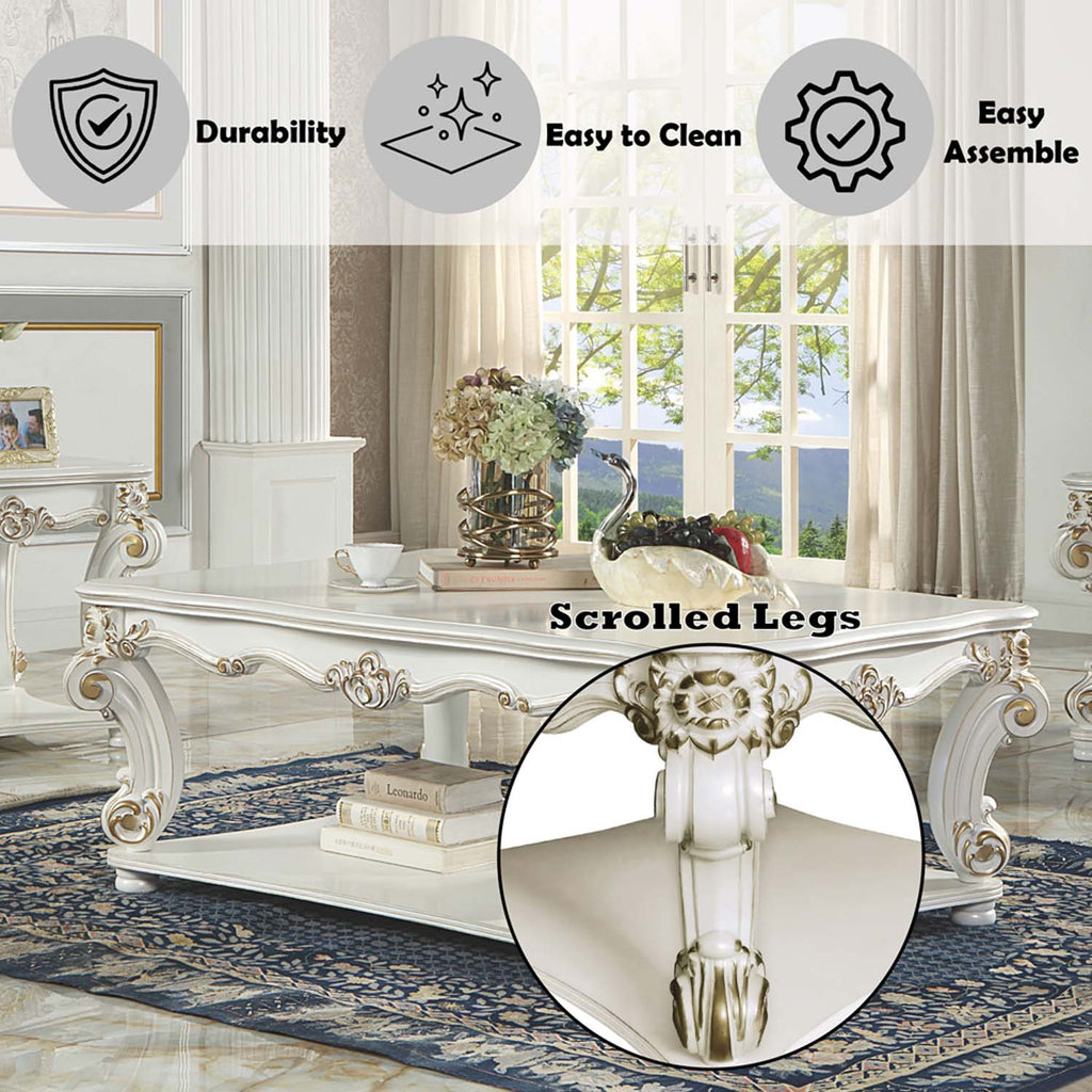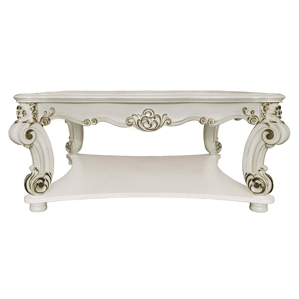 The square shape of the Vendome coffee table offers a spacious surface for placing drinks, books, and other items, making it a practical centerpiece for your living space. Its versatile design complements a range of interior styles, from traditional to transitional. The shelf below the tabletop provides extra storage space for magazines, remote controls, or decorative items. The antique pearl white finish adds the perfect amount of vintage charm. Crafted with meticulous attention to detail, this coffee table seamlessly blends functionality with timeless aesthetics. The combination of the scrolled details and bun legs creates an eye-catching piece that exudes elegance and refinement.