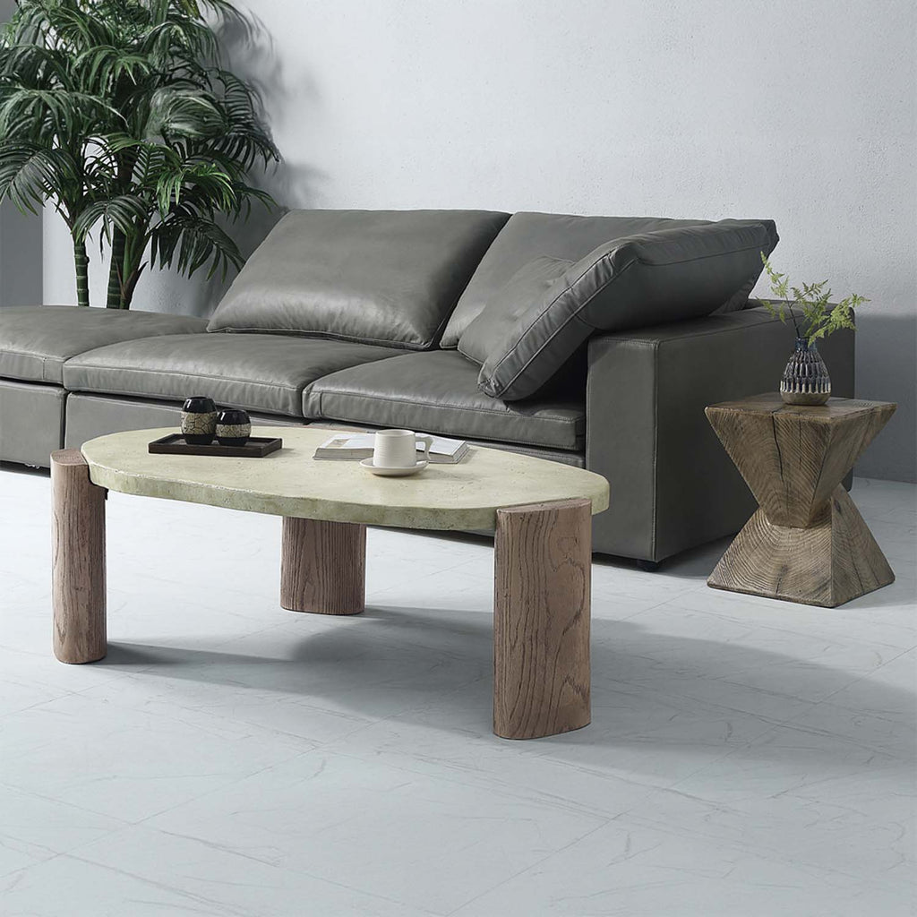 Bring the outside indoors with this nature-inspired Jacinda coffee table. This table is constructed from cement for a stylish design choice. The table has various ranges of textures, such as a smooth tabletop and faux wooden textured legs, and an oblong form for a graphic lure. With a large enough tabletop to hold a few decorative items. The weathered gray and oak finish make for a unique piece. This coffee table would be a stylish and sustainable addition to any living space, demonstrating that natural elements and contemporary design can go hand in hand.