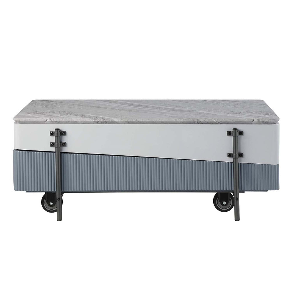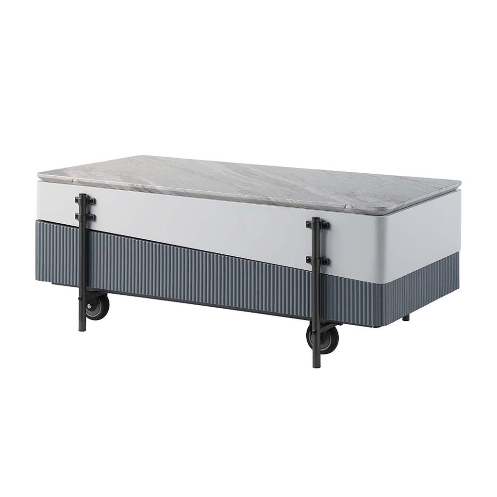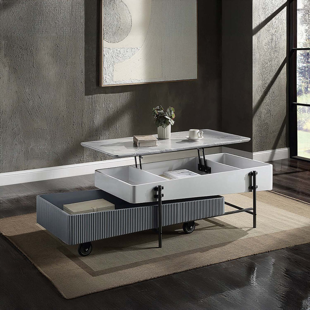 The Wilkins coffee table is perfect for those who are trying to expand their storage needs without adding clunky furniture. Designed to maximize space, this multi-purpose coffee table comes with a lift top so that you can work from the comfort of your couch. Under the lift top, there are three storage compartments, perfect for storing your laptop and charger. The lower portion of the table pulls out to reveal even more storage space. The white and gray high gloss finish is perfect for a modern cozy home.