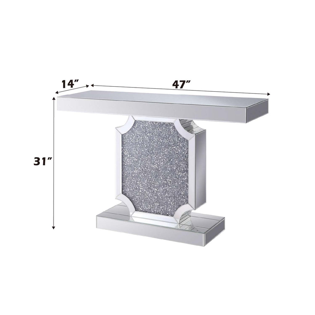 The Noralie Console Table will add a contemporary touch to any room in your home. With its clean lines, this brilliant rectangular occasional table showcases a distinctive style for an intriguing look. The table features a fully mirrored beveled table top and unique geometric pedestal base with a spectacular faux diamond inlay. This unique accent piece complements a wide range of Decor and its modern design is a useful addition to any living area.