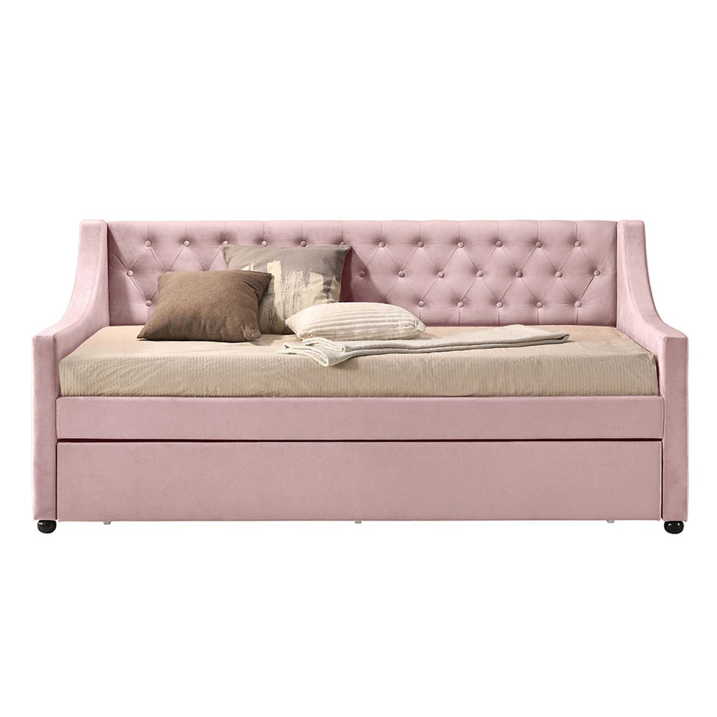 The fully upholstered daybed embodies a classic aesthetic infused with rich textures. Wooden frame is graced with gentle curves and elegant details while button-tufted velvet upholstery makes you indulge in a luxurious comfort. An additional trundle underneath the daybed offers extra sleeping option for overnight guest. Beautiful, comfortable and space-saving, the Lianna Daybed is one of the most versatile pieces you don't want to miss.