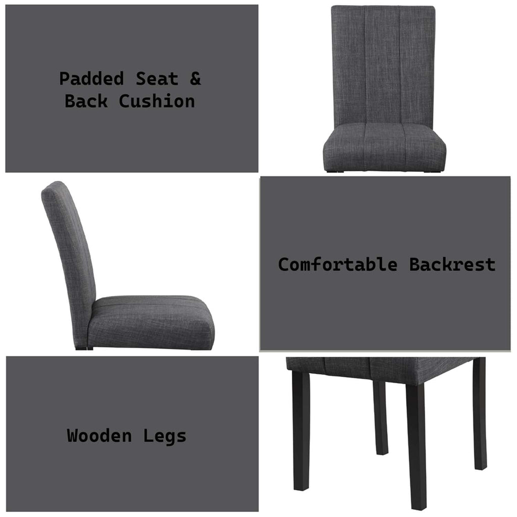 Gone are the days of having to stress out about finding the right chairs for a dining table; with the Kusa 5-piece dining set you can dine stress-free. Perfect for a smaller dining space or in a breakfast nook. The engineered stone top is ideal for those who want a high-end look. It is less prone to staining, unlike traditional marble. The black table base and chair feet are modern. The gray fabric upholstery is contemporary and soft to the touch.
