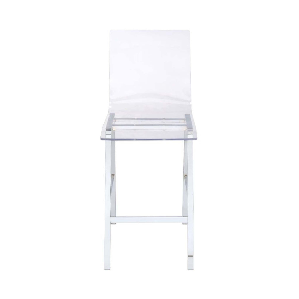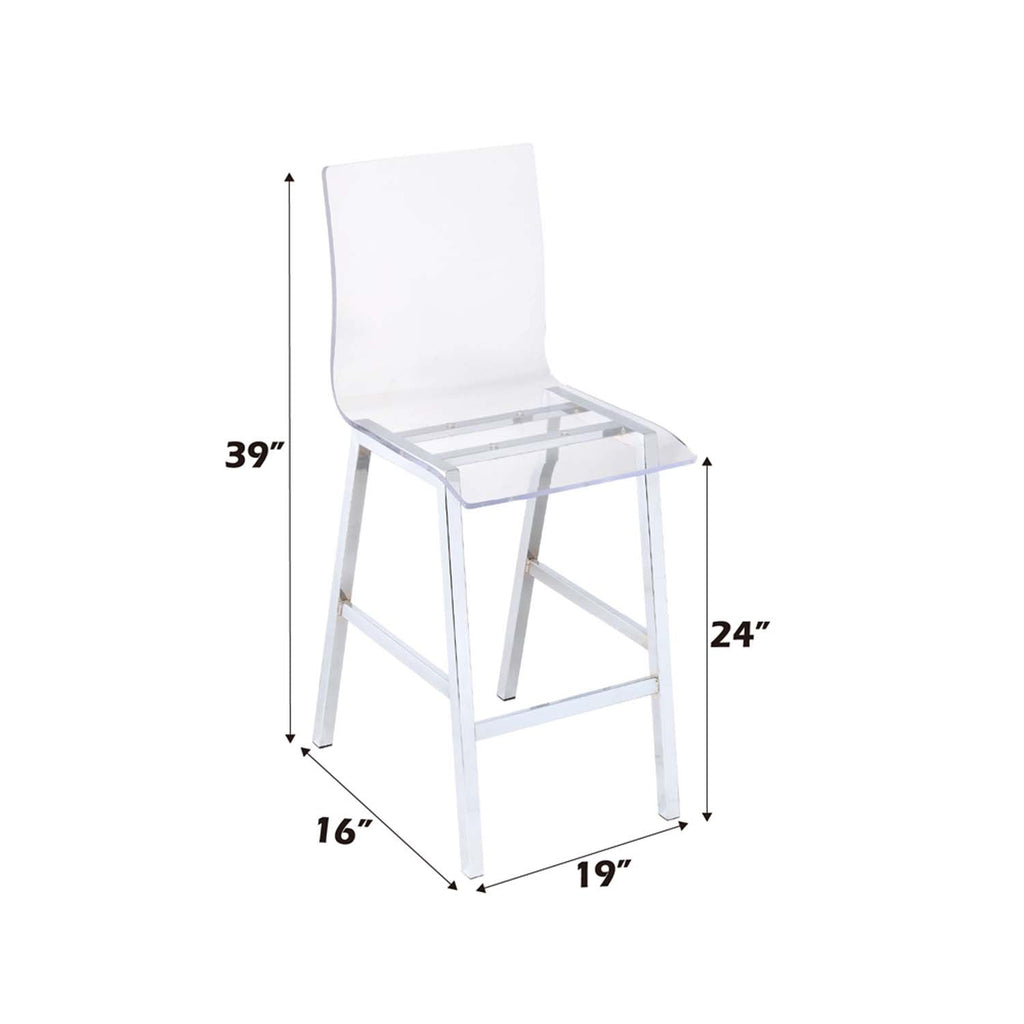 The Nadie counter height chairs feature bent acrylic seats and back support, formed to be comfortable yet stylish. With a chrome finish metal frame and heavy duty acrylic seat, these artistic chairs are sturdily and dependably built. Matching with the stark chrome base table, you'll be struck in a daze by its modern design every time you walk by the dining area.