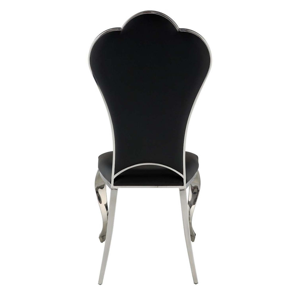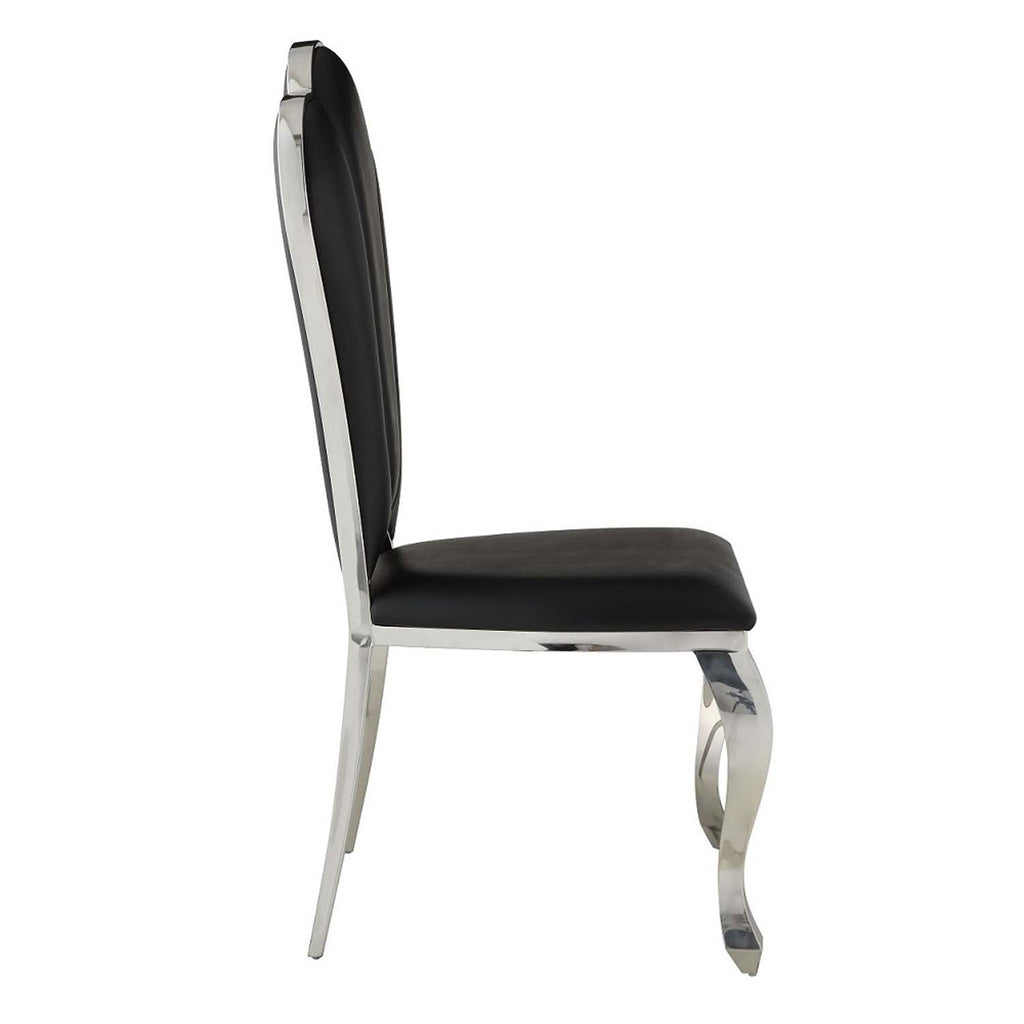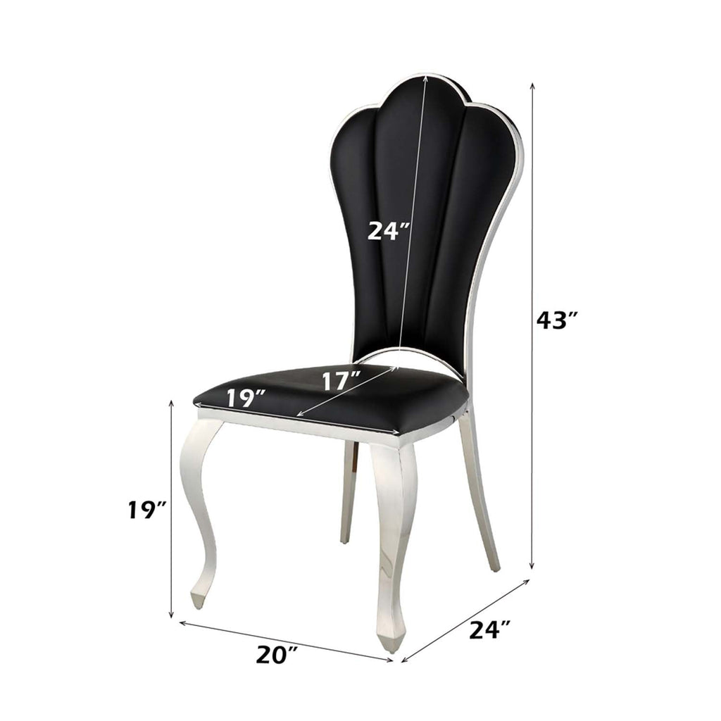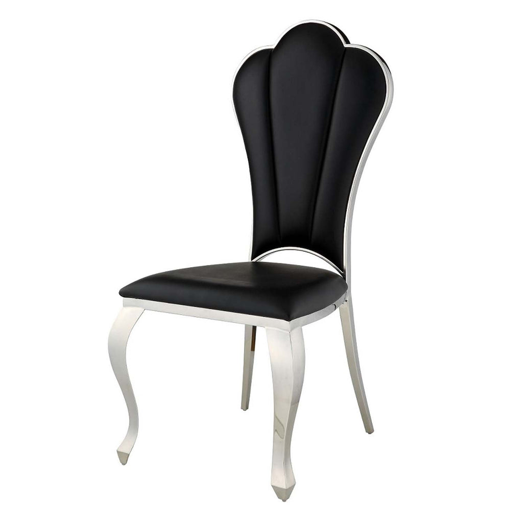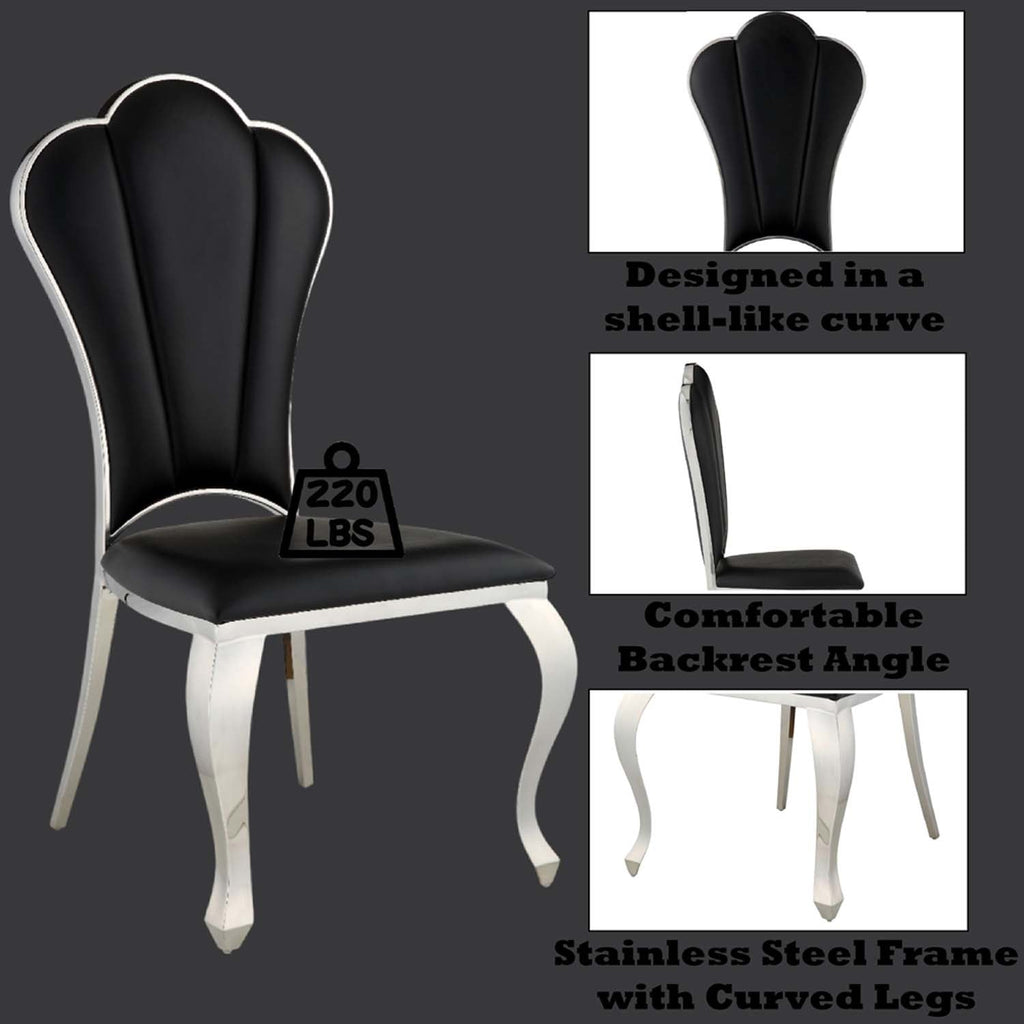 The Cyrene side chairs offer a visually stunning place to sit on and enjoy meals. The chairs are beautifully scalloped and are accentuated with a shiny stainless-steel frame. The black PU upholstery is soft and stylish. The padded seats offer plenty of support and comfort that will last for hours. Available in beige and black.